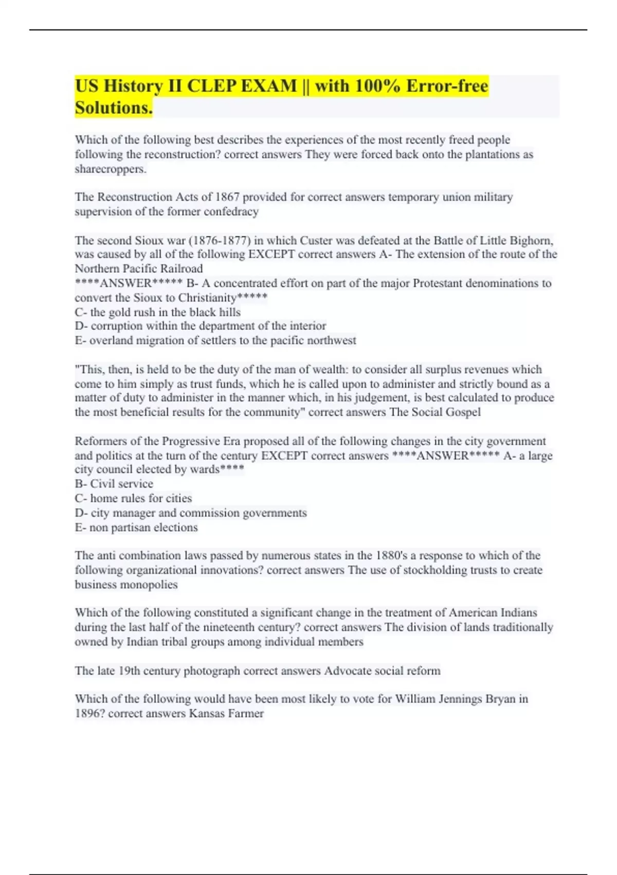 Which of the following best describes the experiences of the most recently freed people following the reconstruction? correct answers They were forced back onto the plantations as sharecroppers. The Reconstruction Acts of 1867 provided for correct answers temporary union military supervision of the former confedracy The second Sioux war () in which Custer was defeated at the Battle of Little Bighorn, was caused by all of the following EXCEPT correct answers A- The extension of the route of the Northern Pacific Railroad ****ANSWER***** B- A concentrated effort on part of the major Protestant denominations to convert the Sioux to Christianity***** C- the gold rush in the black hills D- corruption within the department of the interior E- overland migration of settlers to the pacific northwest "This, then, is held to be the duty of the man of wealth: to consider all surplus revenues which come to him simply as trust funds, which he is called upon to administer and strictly bound as a matter of duty to administer in the manner which, in his judgement, is best calculated to produce the most beneficial results for the community" correct answers The Social Gospel Reformers of the Progressive Era proposed all of the following changes in the city government and politics at the turn of the century EXCEPT correct answers ****ANSWER***** A- a large city council elected by wards**** B- Civil service C- home rules for cities D- city manager and commission governments E- non partisan elections The anti combination laws passed by numerous states in the 1880's a response to which of the following organizational innovations? correct answers The use of stockholding trusts to create business monopolies Which of the following constituted a significant change in the treatment of American Indians during the last half of the nineteenth century? correct answers The division of lands traditionally owned by Indian tribal groups among individual members The late 19th century photograph correct answers Advocate social reform Which of the following would have been most likely to vote for William Jennings Bryan in 1896? correct answers Kansas Farmer