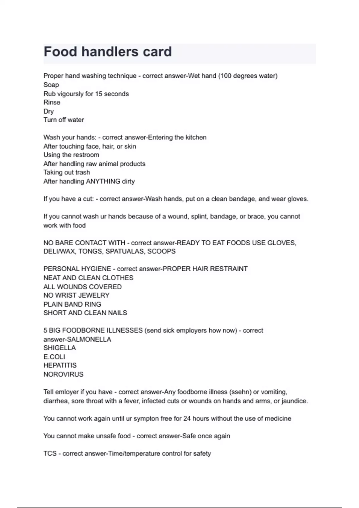 Food handlers card with complete solution