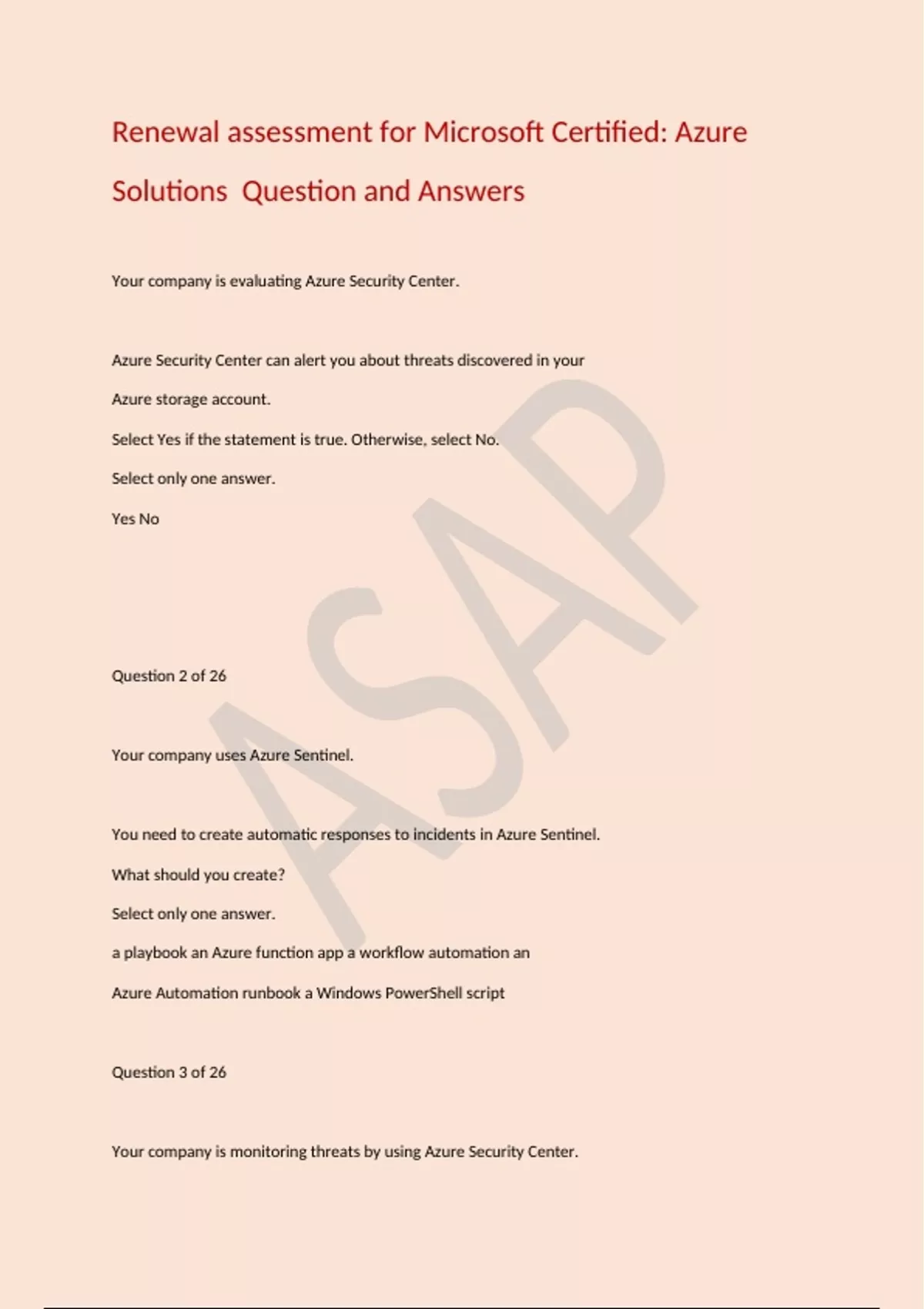 Renewal assessment for Microsoft Certified: Azure Solutions Question and Answers Your company is evaluating Azure Security Center. Azure Security Center can alert you about threats discovered in your Azure storage account. Select Yes if the statement is true. Otherwise, select No. Select only one answer. Yes No Question 2 of 26 Your company uses Azure Sentinel. You need to create automatic responses to incidents in Azure Sentinel. What should you create? Select only one answer. a playbook an Azure function app a workflow automation an Azure Automation runbook a Windows PowerShell script Question 3 of 26 Your company is monitoring threats by using Azure Security Center. You need to use Azure Security Center to automate the responses to discovered threats. What should you create? Select only one answer. a webhook an Azure function app a workflow automation an Azure Automation runbook a Windows PowerShell script Question 4 of 26 You have an Azure subscription named Sub1 that contains a .NET Core web app named webapp1. You are creating an Azure pipeline named pipeline1 that will deploy updates to webapp1. To pipeline1, you add a stage named stage1 that contains tasks based on the Azure App Service deployment with continuous monitoring template. You need to ensure that the deployment of the updates to webapp1 from pipeline1 will stop automatically if there are existing alerts that correspond to server exceptions, failed requests, server response times, or the availability of webapp1. What should you do? Select only one answer. In stage1, configure gates in the pre-deployment conditions. In stage1, configure triggers in the pre-deployment conditions. In the Configure Application Insights Alerts task of stage1, modify the inline script. In the Configure Application Insights Alerts task of stage1, modify the control options. Question 5 of 26 You are designing an Azure Service Fabric-based app named SFApp1. SFApp1 will store application assets in Azure Blob storage, product reviews and recommendations in Azure Cosmos DB, and user profiles in Azure SQL Database. Individual data updates performed by SFApp1 will occur across all three data stores. You need to recommend an approach that will ensure that individual updates apply across all the data stores with the least impact on the performance and scalability of SFApp1. What should you recommend? Select only one answer. eventual consistency strong consistency serialization locking Question 6 of 26 You have an Azure subscription named Sub1 that contains a .NET web app named webapp1. Webapp1 uses an Azure SQL database named db1 as the data store. Every day, a user named User1 runs multiple consecutive queries targeting the same datasets in db1. User1 reports that webapp1 has a slow response time. You verify that both db1 and webapp1 have sufficient resources to process the queries. You need to improve responses for User1. What should you do? Select only one answer. Configure webapp1 to use Azure Cache for Redis. Configure webapp1 to use the Azure App Service local cache. Modify the pricing tier of webapp1. Modify the pricing tier of db1. Question 7 of 26 You plan to implement a globally distributed web app that will have multiple instances deployed to different Azure regions and on-premises datacenters. The web app will be used by users globally. You need to implement a DNS-based load balancer to ensure that the users are directed to the web app instance that has the lowest network latency. The solution must minimize administrative effort and complexity of the implementation. What should you include in the solution? Select only one answer. Azure Traffic Manager with a performance routing method Azure Traffic Manager with a geographic routing method Azure Standard Load Balancer with source IP affinity distribution mode Azure Application Gateway with a path-based request routing rule Question 8 of 26 You should apply endpoint protection at the perimeter security layer. Select Yes if the statement is true. Otherwise, select No. Select only one answer. Yes No. Question 9 of 26 Deny by default is one of the protection principles at the network security layer. Select Yes if the statement is true. Otherwise, select No. Select only one answer. Yes No Question 10 of 26 When you enable the Use your own key Encryption option for an Azure Storage account, the tables in the storage account will be encrypted by using your own key. Select Yes if the statement is true. Otherwise, select No. Select only one answer. Yes No Question 11 of 26 You have an Azure virtual machine named VM1 that has the following configurations: • Location: East US • Resource group: RG1 • Connected to: VNET1 You enable disaster recovery and replicate VM1 to the West US location. In which resource group is the VM1 replica stored? Select only one Question 12 of 26 You have an Azure subscription that contains a virtual machine named VM1. You plan to configure Azure Site Recovery for VM1. You are defining a replication policy for VM1. What is the maximum recovery point retention? Select only one answer. 12 hours 48 hours 72 hours 7 days Question 13 of 26 Your company plans to implement Azure Site Recovery. During a failover, a new virtual machine is created. Select Yes if the statement is true. Otherwise, select No. Select only one answer. Yes No Question 14 of 26 Your company plans to perform a disaster recovery drill of a replicated virtual machine. During a disaster recovery drill, a new Azure virtual machine is created. Select Yes if the statement is true. Otherwise, select No. Select only one answer. Yes No Question 15 of 26 Your company plans to perform a disaster recovery drill of a replicated virtual machine. A recovery plan is required if you want to perform a disaster recovery drill of a virtual machine. Select Yes if the statement is true. Otherwise, select No. Select only one answer. Yes No Question 16 of 26 You have an Azure virtual machine named VM1 in the East US location and