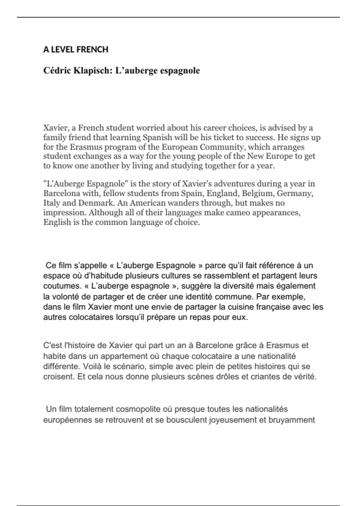 Cédric Klapisch: L’auberge espagnole: A LEVEL FRENCH EXAM QUESTIONS