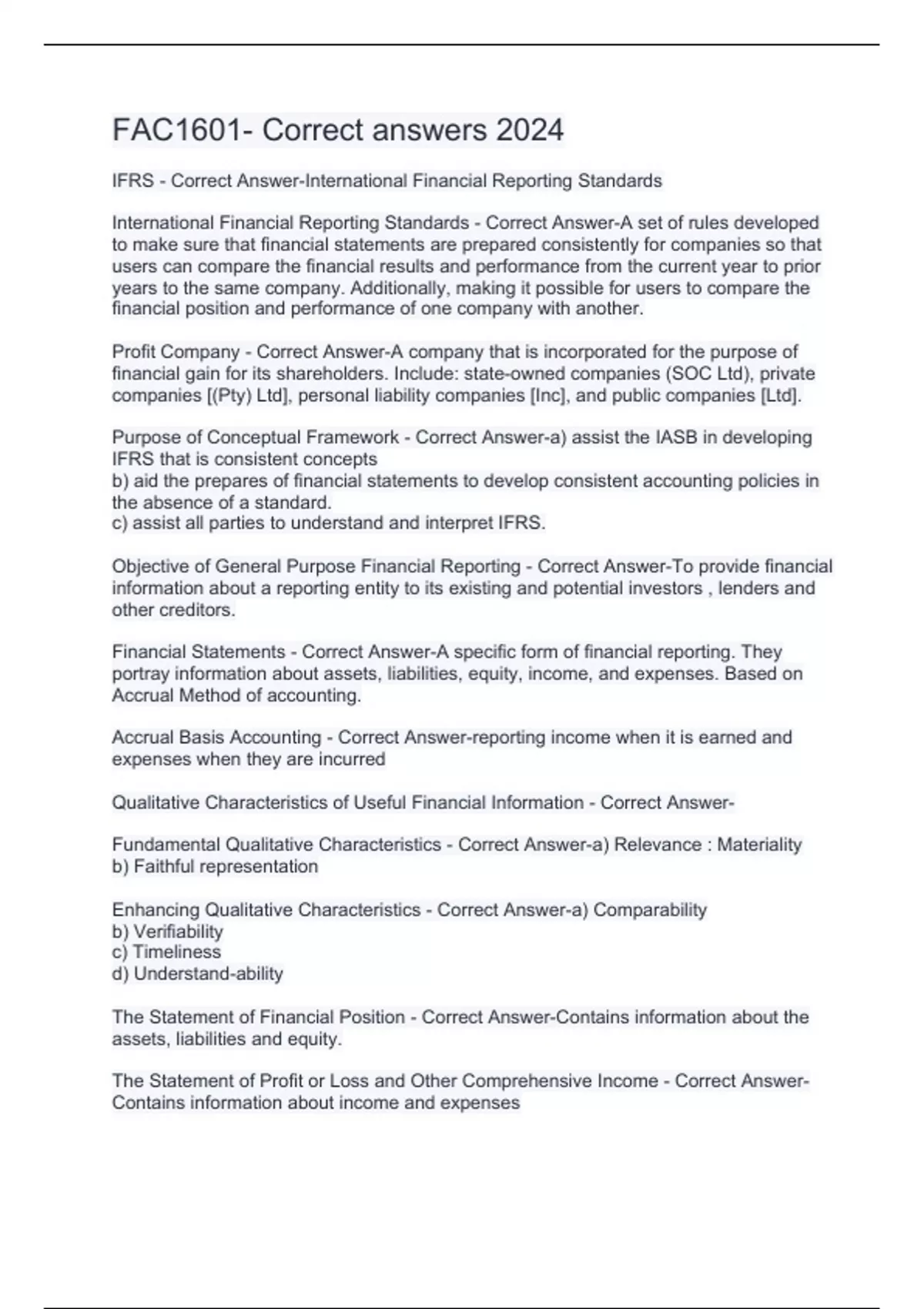 FAC1601- Correct answers 2024