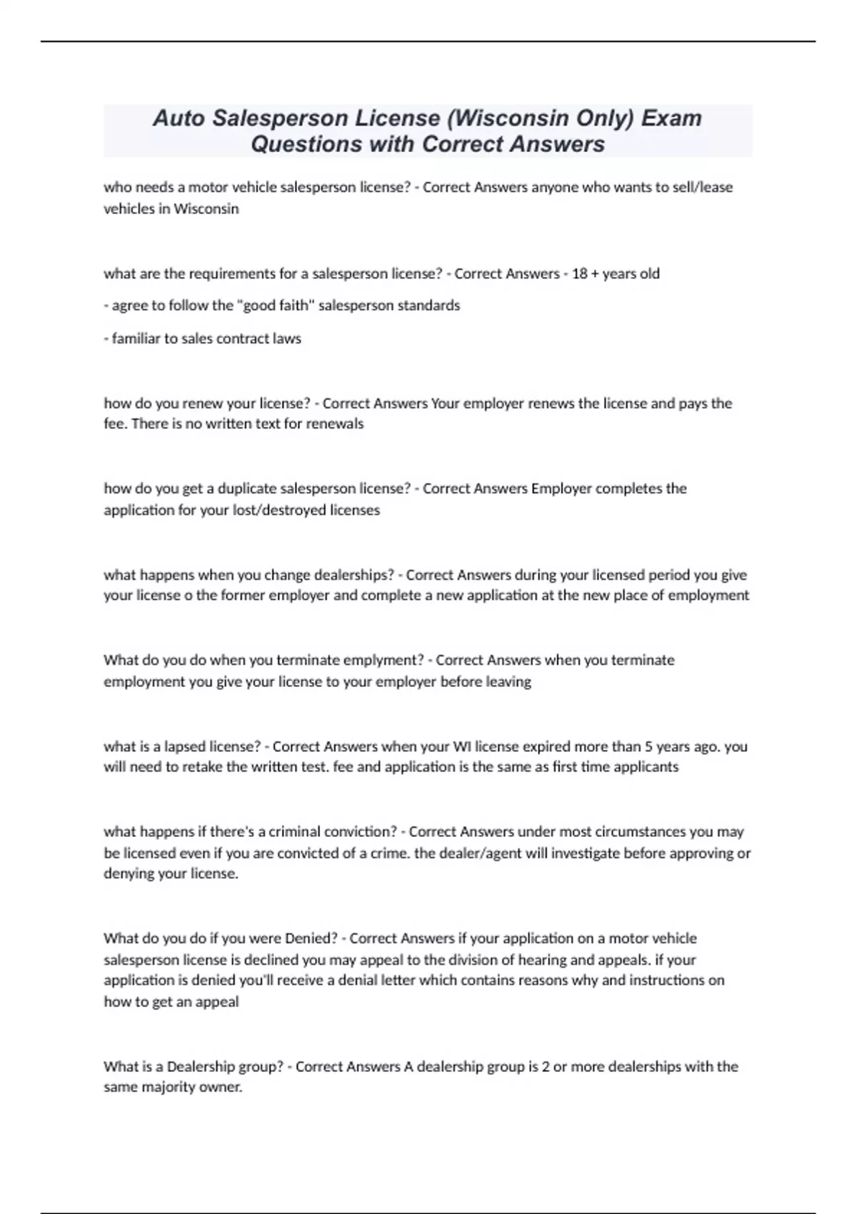 Auto Salesperson License (Wisconsin Only) Exam Questions with Correct Answers who needs a motor vehicle salesperson license? - Correct Answers anyone who wants to sell/lease vehicles in Wisconsin what are the requirements for a salesperson license? - Correct Answers - 18 + years old - agree to follow the "good faith" salesperson standards - familiar to sales contract laws how do you renew your license? - Correct Answers Your employer renews the license and pays the fee. There is no written text for renewals how do you get a duplicate salesperson license? - Correct Answers Employer completes the application for your lost/destroyed licenses what happens when you change dealerships? - Correct Answers during your licensed period you give your license o the former employer and complete a new application at the new place of employment What do you do when you terminate emplyment? - Correct Answers when you terminate employment you give your license to your employer before leaving what is a lapsed license? - Correct Answers when your WI license expired more than 5 years ago. you will need to retake the written test. fee and application is the same as first time applicants what happens if there's a criminal conviction? - Correct Answers under most circumstances you may be licensed even if you are convicted of a crime. the dealer/agent will investigate before approving or denying your license. What do you do if you were Denied? - Correct Answers if your application on a motor vehicle salesperson license is declined you may appeal to the division of hearing and appeals. if your application is denied you'll receive a denial letter which contains reasons why and instructions on how to get an appeal What is a Dealership group? - Correct Answers A dealership group is 2 or more dealerships with the same majority owner. What arent you allowed to do when Advertising? - Corre