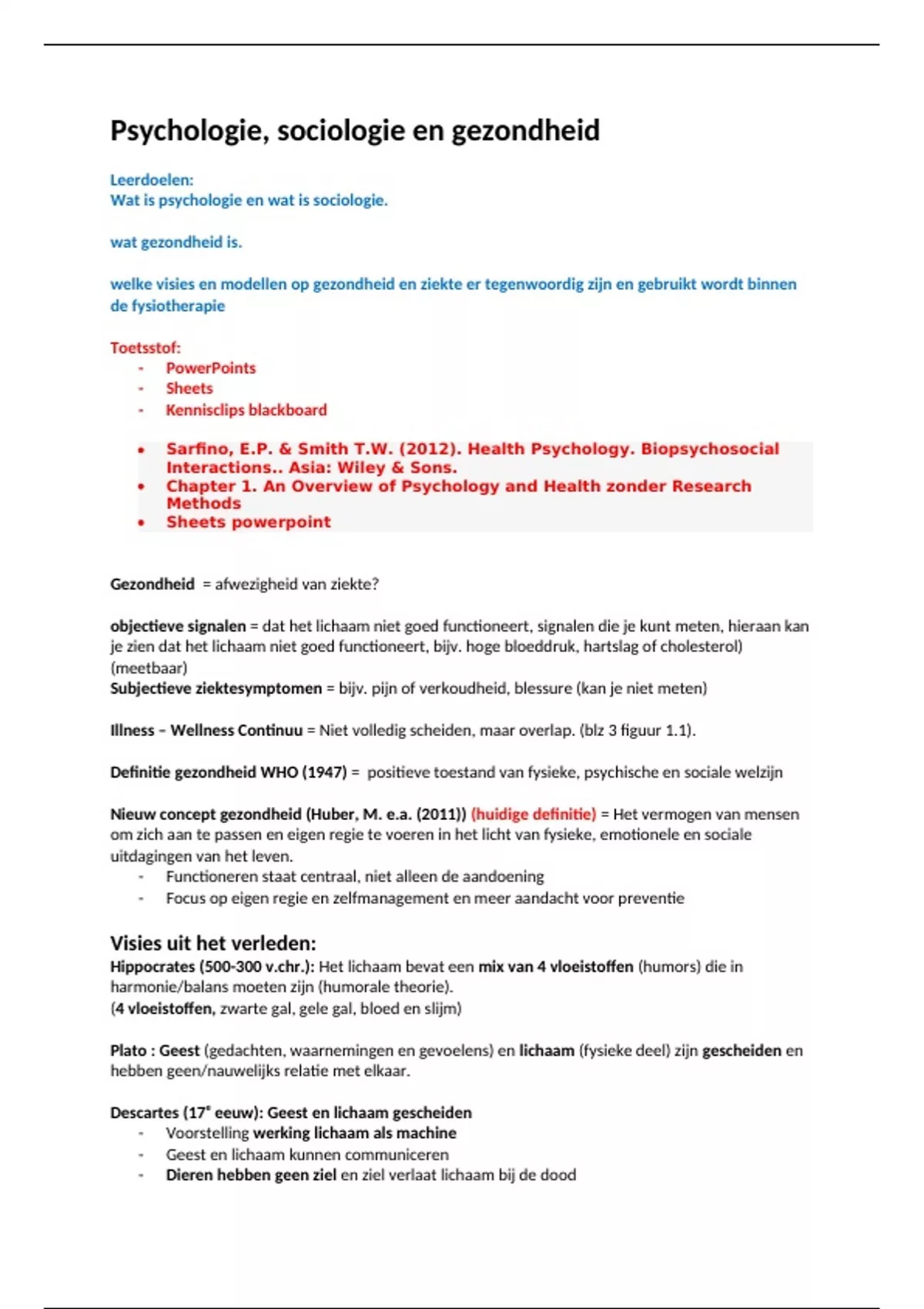 Definitie gezondheid WHO (1947) = positieve toestand van fysieke, psychische en sociale welzijn