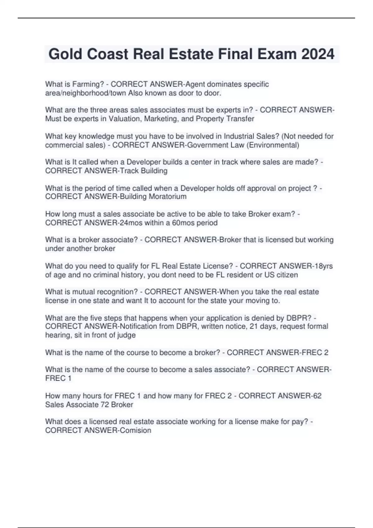 Gold Coast Real Estate Final Exam 2024 What is Farming? - CORRECT ANSWER-Agent dominates specific area/neighborhood/town Also known as door to door. What are the three areas sales associates must be experts in? - CORRECT ANSWERMust be experts in Valuation, Marketing, and Property Transfer What key knowledge must you have to be involved in Industrial Sales? (Not needed for commercial sales) - CORRECT ANSWER-Government Law (Environmental) What is It called when a Developer builds a center in track where sales are made? - CORRECT ANSWER-Track Building What is the period of time called when a Developer holds off approval on project ? - CORRECT ANSWER-Building Moratorium How long must a sales associate be active to be able to take Broker exam? - CORRECT ANSWER-24mos within a 60mos period What is a broker associate? - CORRECT ANSWER-Broker that is licensed but working under another broker What do you need to qualify for FL Real Estate License? - CORRECT ANSWER-18yrs of age and no criminal history, you dont need to be FL resident or US citizen What is mutual recognition? - CORRECT ANSWER-When you take the real estate license in one state and want It to account for the state your moving to. What are the five steps that happens when your application is denied by DBPR? - CORRECT ANSWER-Notification from DBPR, written notice, 21 days, request formal hearing, sit in front of judge What is the name of the course to become a broker? - CORRECT ANSWER-FREC 2 What is the name of the