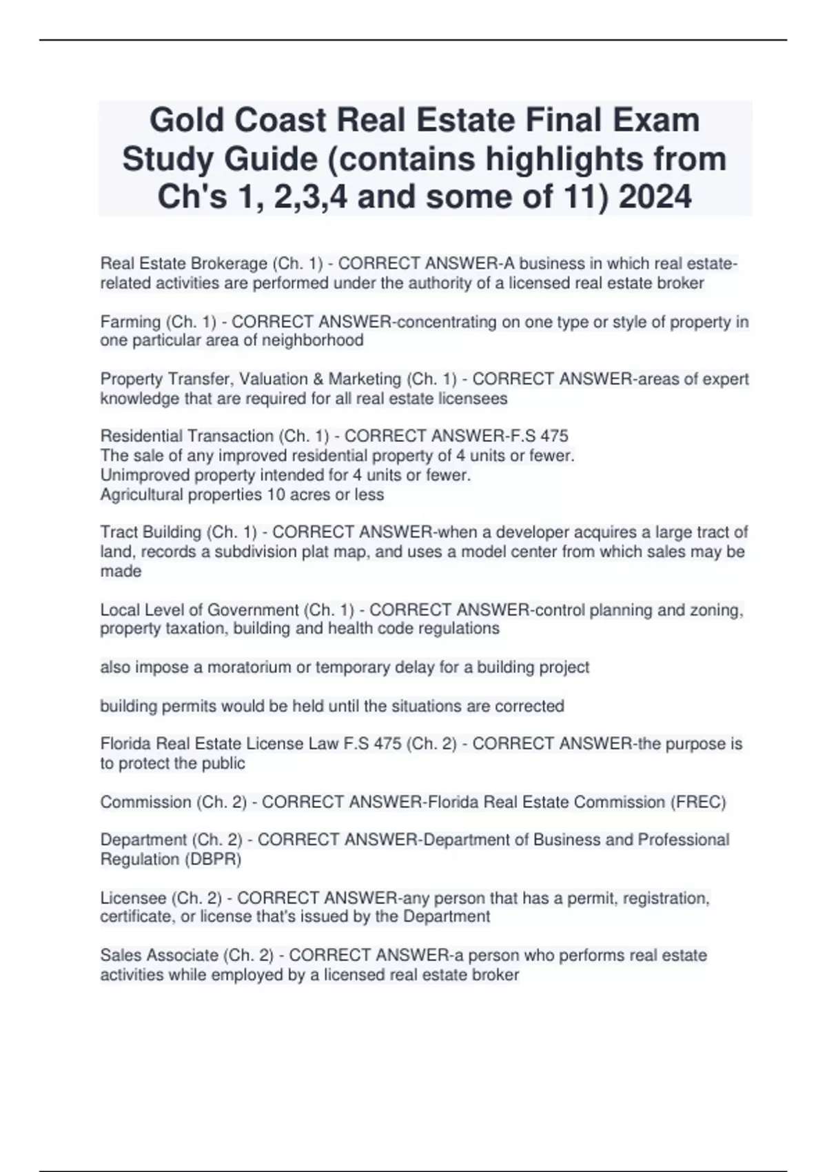 Gold Coast Real Estate Final Exam Study Guide (contains highlights from Ch's 1, 2,3,4 and some of 11) 2024 Real Estate Brokerage (Ch. 1) - CORRECT ANSWER-A business in which real estaterelated activities are performed under the authority of a licensed real estate broker Farming (Ch. 1) - CORRECT ANSWER-concentrating on one type or style of property in one particular area of neighborhood Property Transfer, Valuation & Marketing (Ch. 1) - CORRECT ANSWER-areas of expert knowledge that are required for all real estate licensees Residential Transaction (Ch. 1) - CORRECT ANSWER-F.S 475 The sale of any improved residential property of 4 units or fewer. Unimproved property intended for 4 units or fewer. Agricultural properties 10 acres or less Tract Building (Ch. 1) - CORRECT ANSWER-when a developer acquires a large tract of land, records a subdivision plat map, and uses a model center from which sales may be made Local Level of Government (Ch. 1) - CORRECT ANSWER-control planning and zoning, property taxation, building and health code regulations also impose a moratorium or temporary delay for a building project building permits would be held until the situations are corrected Florida Real Estate License Law F.S 475 (Ch. 2) - CORRECT ANSWER-the purpose is to protect the public Commission (Ch. 2) - CORRECT ANSWER-Florida Real Estate Commission (FREC) Department (Ch. 2) - CORRECT ANSWER-Department of Business and Professional Regulation (DBPR) Licensee (Ch. 2) - CORRECT ANSWER-any person that has a permit, registration, certificate, or license that's issued by the Department Sales Associate (Ch. 2) - CORRECT ANSWER-a person who performs real estate activities while employed by a licensed real estate broker Broker (Ch. 2) - CORRECT ANSWER-a person who performs services of real estate for another and receives compensation for those services either directly or indirectly A sales associate who wishes to a broker must: (Ch. 2) - CORRECT ANSWER-have been employed under one or more actively licensed brokers for at least 24 months within the previous 5 years Broker Associate (Ch. 2) - CORRECT ANSWER-an applicant to become a "broker associate" may chose to continue employment in a sales associate position with current employer after passing the exam but will be registered under a "broker associate" after passing the exam an individual who meets the requirements of a broker but who chooses to work in real estate under the direction (employ) of another broker. An applicant for a Florida real estate license is not required to be a: (Ch. 2) - CORRECT ANSWER-resident of Florida or be a citizen of the U.S The question that requires the disclosure of any criminal convictions, including felony or misdemeanor convictions or pleas (other than traffic offenses), regardless of adjudication (going to court) DUI must be disclosed (Ch. 2) - CORRECT ANSWER-"Have you ever been convicted of a felony or found guilty of, or entered a plea of "nolo contendere" (no contest) or guilty to, regardless of adjudication ,a crime in any jurisdiction, or are you currently being investigated?" Application Denial (Ch. 2) - CORRECT ANSWER-If an application to take the state exam is denied by the Department, the applicant will be notified in writing. The notification will identify the reasons for denial and advise the applicant that he or she has 21 days from the date of receipt to request a formal