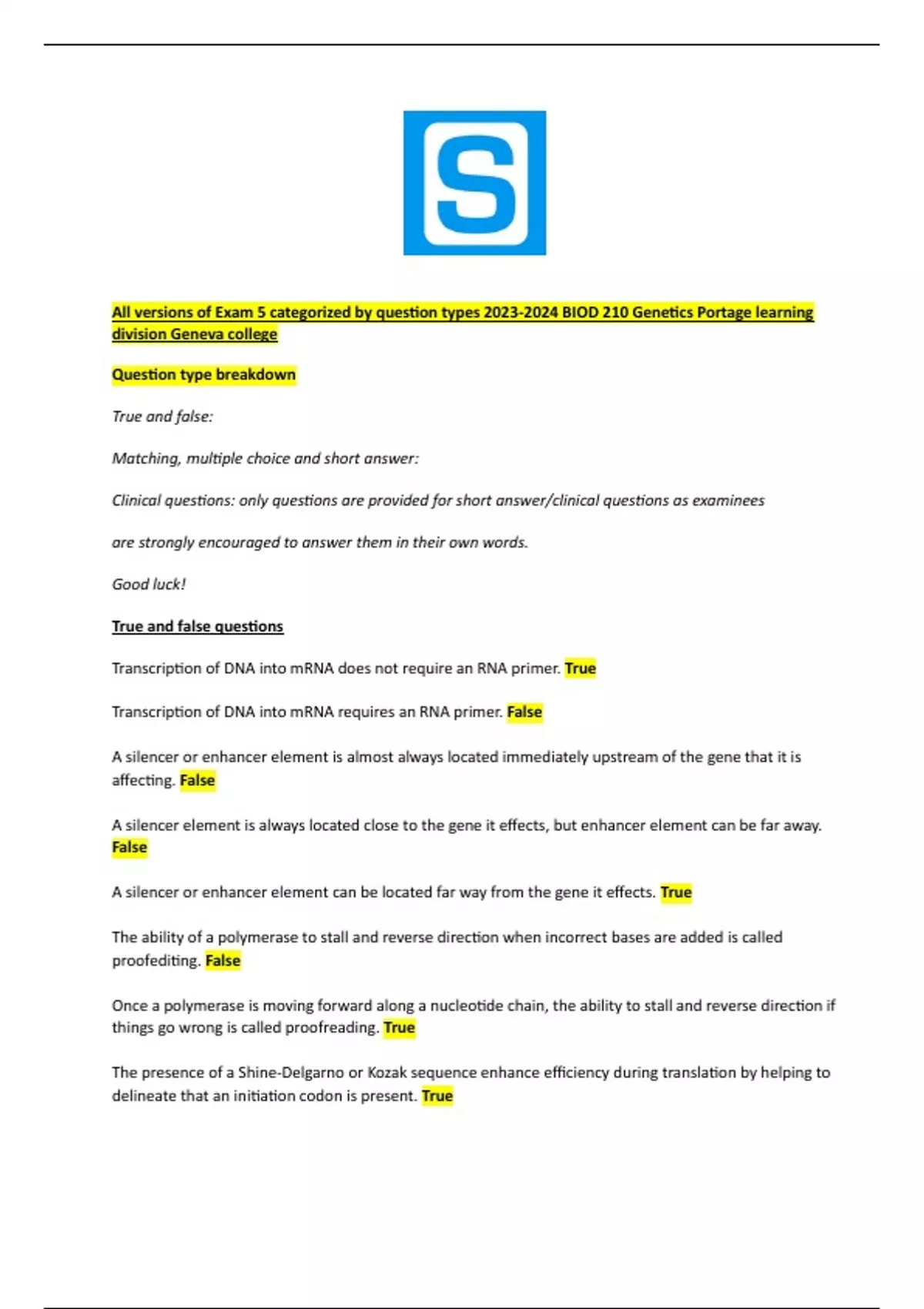 All versions of Exam 5 categorized by question types 2023-2024 BIOD 210 Genetics Portage learning