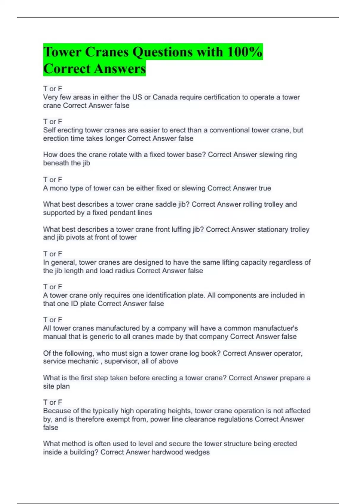 T or F Very few areas in either the US or Canada require certification to operate a tower crane Correct Answer false T or F Self erecting tower cranes are easier to erect than a conventional tower crane, but erection time takes longer Correct Answer false How does the crane rotate with a fixed tower base? Correct Answer slewing ring beneath the jib T or F A mono type of tower can be either fixed or slewing Correct Answer true What best describes a tower crane saddle jib? Correct Answer rolling trolley and supported by a fixed pendant lines What best describes a tower crane front luffing jib? Correct Answer stationary trolley and jib pivots at front of tower T or F In general, tower cranes are designed to have the same lifting capacity regardless of the jib length and load radius Correct Answer false T or F A tower crane only requires one identification plate. All components are included in that one ID plate Correct Answer false T or F All tower cranes manufactured by a company will have a common manufactuer's manual that is generic to all cranes made by that company Correct Answer false Of the following, who must sign a tower crane log book? Correct Answer operator, service mechanic , supervisor, all of above What is the first step taken before erecting a tower crane? Correct Answer prepare a site plan T or F Because of the typically high operating heights, tower crane operation is not affected by, and is therefore exempt from, power line clearance regulations Correct Answer false What method is often used to level and secure the tower structure being erected inside a building? Correct Answer hardwood wedges
