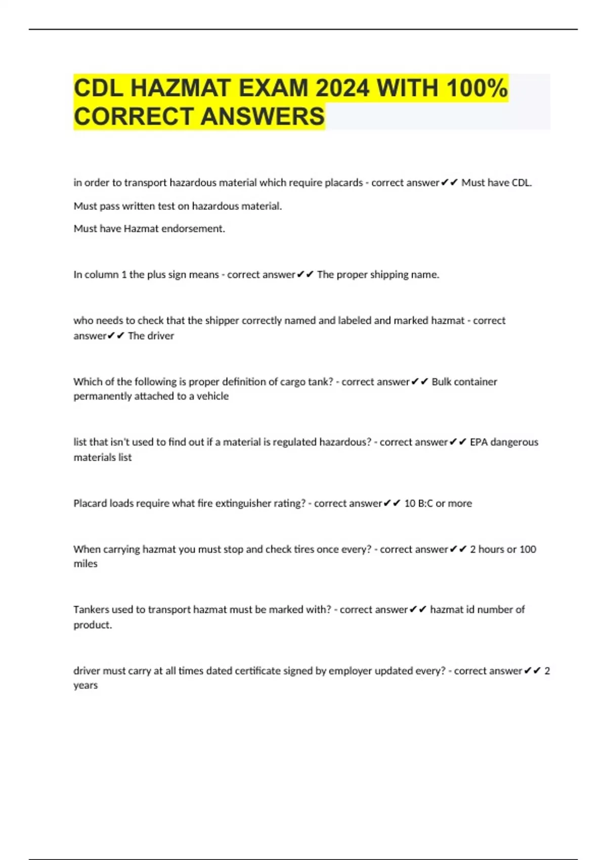 CDL HAZMAT EXAM 2024 WITH 100% CORRECT ANSWERS in order to transport hazardous material which require placards - correct answer Must have CDL. Must pass written test on hazardous material. Must have Hazmat endorsement. In column 1 the plus sign means - correct answer The proper shipping name. who needs to check that the shipper correctly named and labeled and marked hazmat - correct answer The driver Which of the following is proper definition of cargo tank? - correct answer Bulk container permanently attached to a vehicle list that isn't used to find out if a material is regulated hazardous? - correct answer EPA dangerous materials list Placard loads require what fire extinguisher rating? - correct answer 10 B:C or more When carrying hazmat you must stop and check tires once every? - correct answer 2 hours or 100 miles Tankers used to transport hazmat must be marked with? - correct answer hazmat id number of product.
