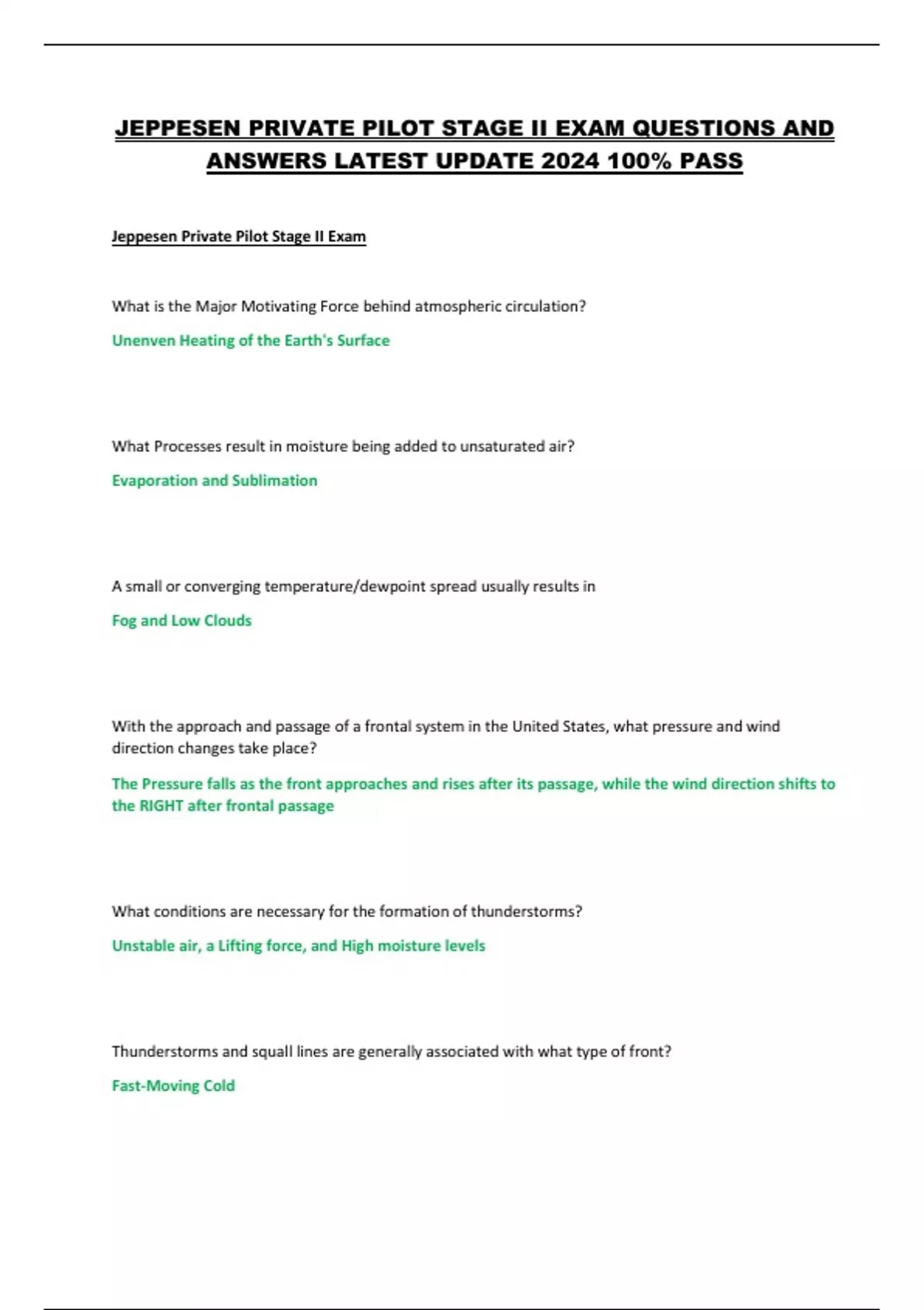 JEPPESEN PRIVATE PILOT STAGE II EXAM QUESTIONS AND ANSWERS LATEST UPDATE 2024 100% PASS JEPPESEN PRIVATE PILOT STAGE II EXAM QUESTIONS AND ANSWERS LATEST UPDATE 2024 100% PASS JEPPESEN PRIVATE PILOT STAGE II EXAM QUESTIONS AND ANSWERS LATEST UPDATE 2024 100% PASS Jeppesen Private Pilot Stage II Exam What is the Major Motivating Force behind atmospheric circulation? Unenven Heating of the Earth's Surface What Processes result in moisture being added to unsaturated air? Evaporation and Sublimation A small or converging temperature/dewpoint spread usually results in Fog and Low Clouds With the approach and passage of a frontal system in the United States, what pressure and wind direction changes take place? The Pressure falls as the front approaches and rises after its passage, while the wind direction shifts to the RIGHT after frontal passage What conditions are necessary for the formation of thunderstorms? Unstable air, a Lifting force, and High moisture levels Thunderstorms and squall lines are generally associated with what type of front?