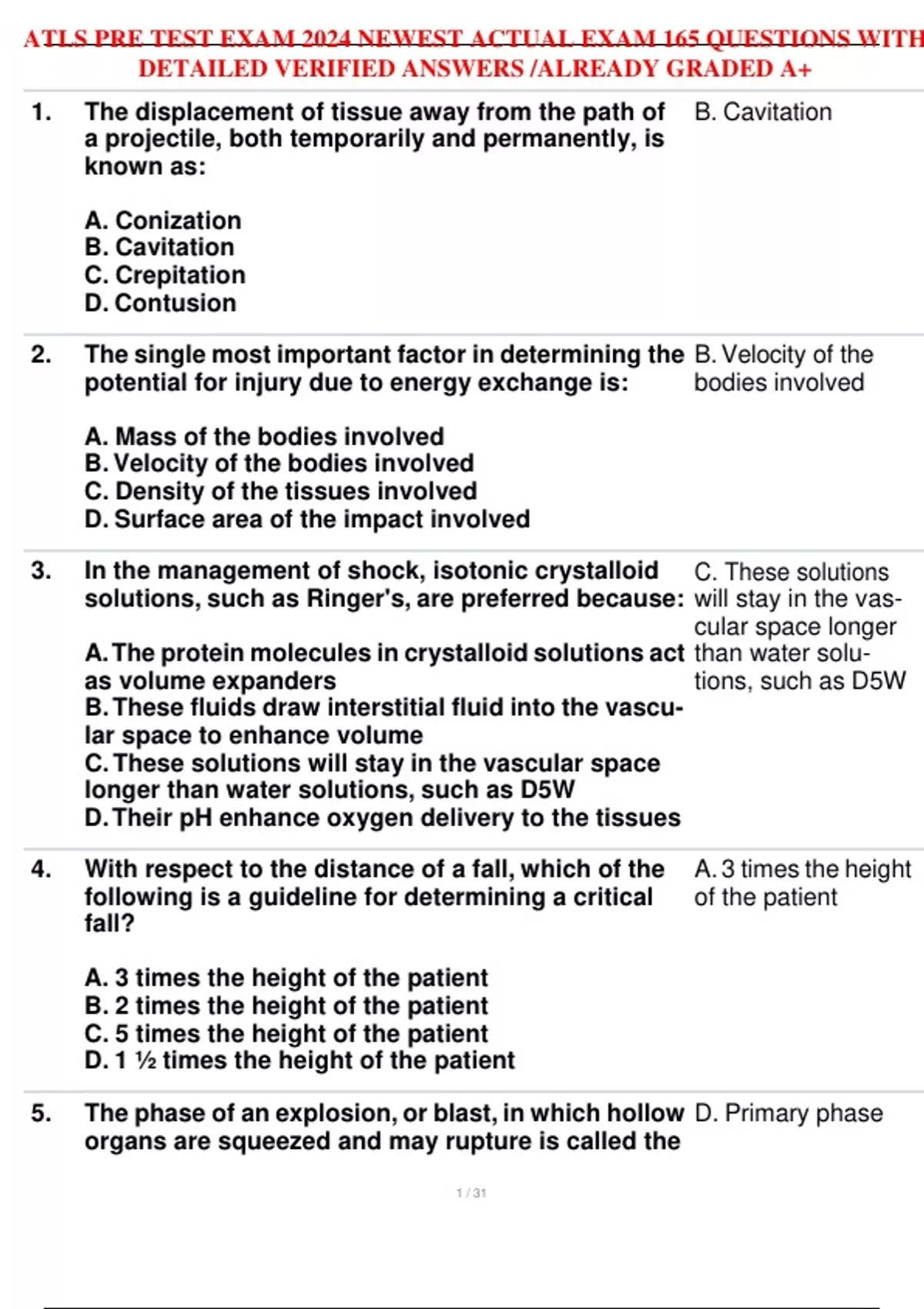 ATLS PRE TEST EXAM 2024 NEWEST ACTUAL EXAM 165 QUESTIONS WITH DETAILED VERIFIED ANSWERS /ALREADY GRADED A+