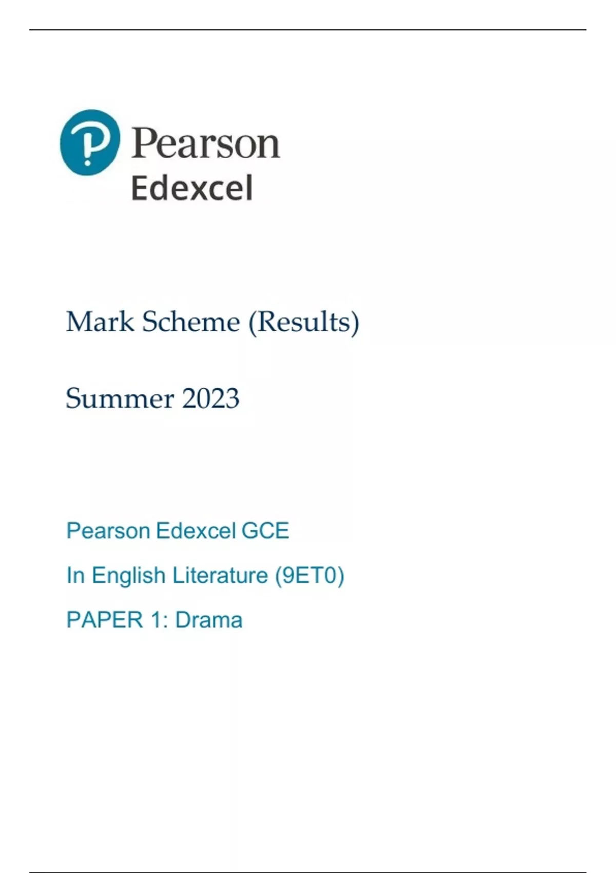 Pearson Edexcel GCE English Literature Advanced paper 1(9ET0/01:Drama)MARK SCHEME for June 2023
