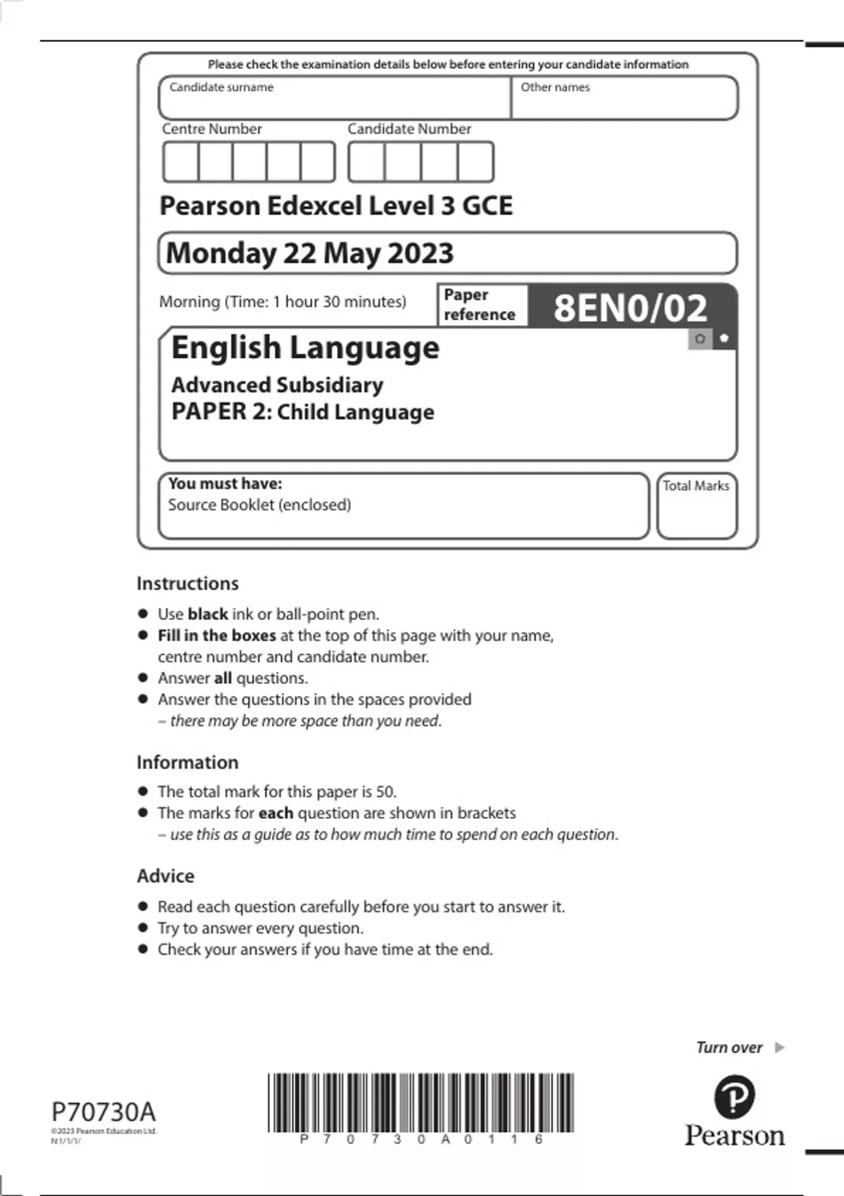 Pearson Edexcel GCE English Language Advanced subsidiary Paper 2(8EN0/02: Child Language)June 2023 Question paper