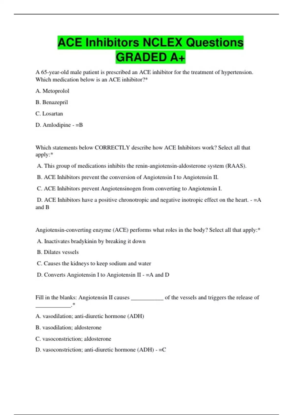 ACE Inhibitors NCLEX Questions GRADED A+