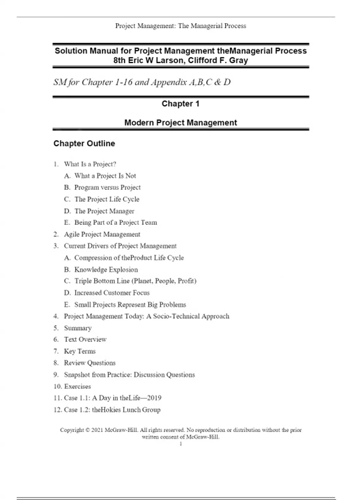 Solution Manual for Project Management The Managerial Process 8th Edition by Eric W Larson, Clifford F. Gray. Ch. 1 Modern Project Management Ch. 2 Organization Strategy and Project Selection Ch. 3 Organization: Structure and Culture Ch. 4 Defining the Project Ch. 5 Estimating Project Times and Costs Ch. 6 Developing a Project Schedule Ch. 7 Managing Risk Ch. 8 Scheduling Resources and Costs Ch. 9 Reducing Project Duration Ch. 10 Being an Effective Project Manager Ch. 11 Managing Project Teams Ch. 12 Outsourcing: Managing Interorganizational Relations Ch. 13 Progress and Performance Measurement and Evaluation Ch. 14 Project Closure Ch. 15 Agile Project Management Ch. 16 International Projects