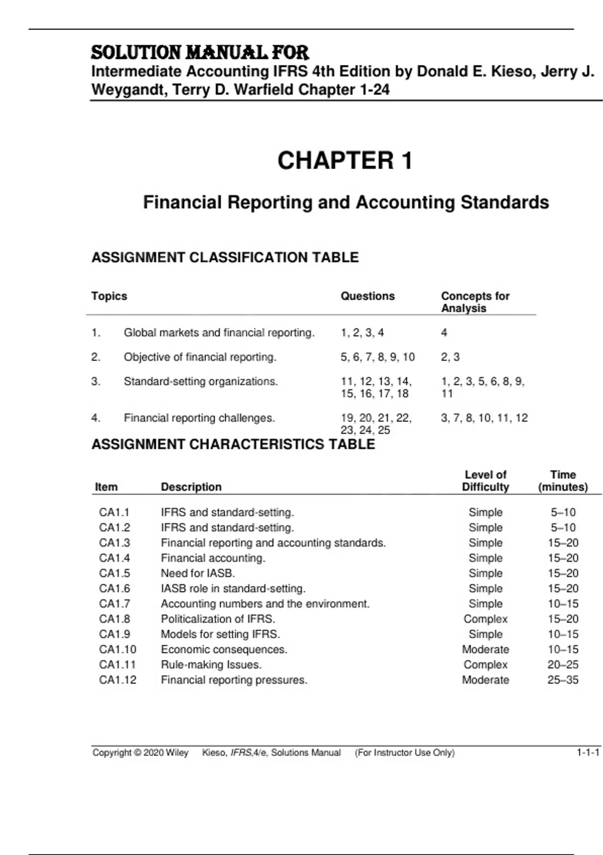 Solution Manual For Intermediate Accounting IFRS 4th Edition by Donald E. Kieso, Jerry J. Weygandt, Terry D. War. TABLE OF CONTENTS 1 Financial Reporting and Accounting Standards 1-1 2 Conceptual Framework for Financial Reporting 2-1 3 The Accounting Information System 3-1 4 Income Statement and Related Information 4-1 5 Statement of Financial Position and Statement of Cash Flows 5-1 6 Accounting and the Time Value of Money 6-1 7 Cash and Receivables 7-1 8 Valuation of Inventories: A Cost-Basis Approach 8-1 9 Inventories: Additional Valuation Issues 9-1 10 Acquisition and Disposition of Property, Plant, and Equipment 10-1 11 Depreciation, Impairments, and Depletion 11-1 12 Intangible Assets 12-1 13 Current Liabilities, Provisions, and Contingencies 13-1 14 Non-Current Liabilities 14-1 15 Equity 15-1 16 Dilutive Securities and Earnings per Share 16-1 17 Investments 17-1 18 Revenue Recognition 18-1 19 Accounting for Income Taxes 19-1 20 Accounting for Pensions and Postretirement Benefits 20-1 21 Accounting for Leases 21-1 22 Accounting Changes and Error Analysis 22-1 23 Statement of Cash Flows 23-1 24 Presentation and Disclosure in Financial Reporting 24-1