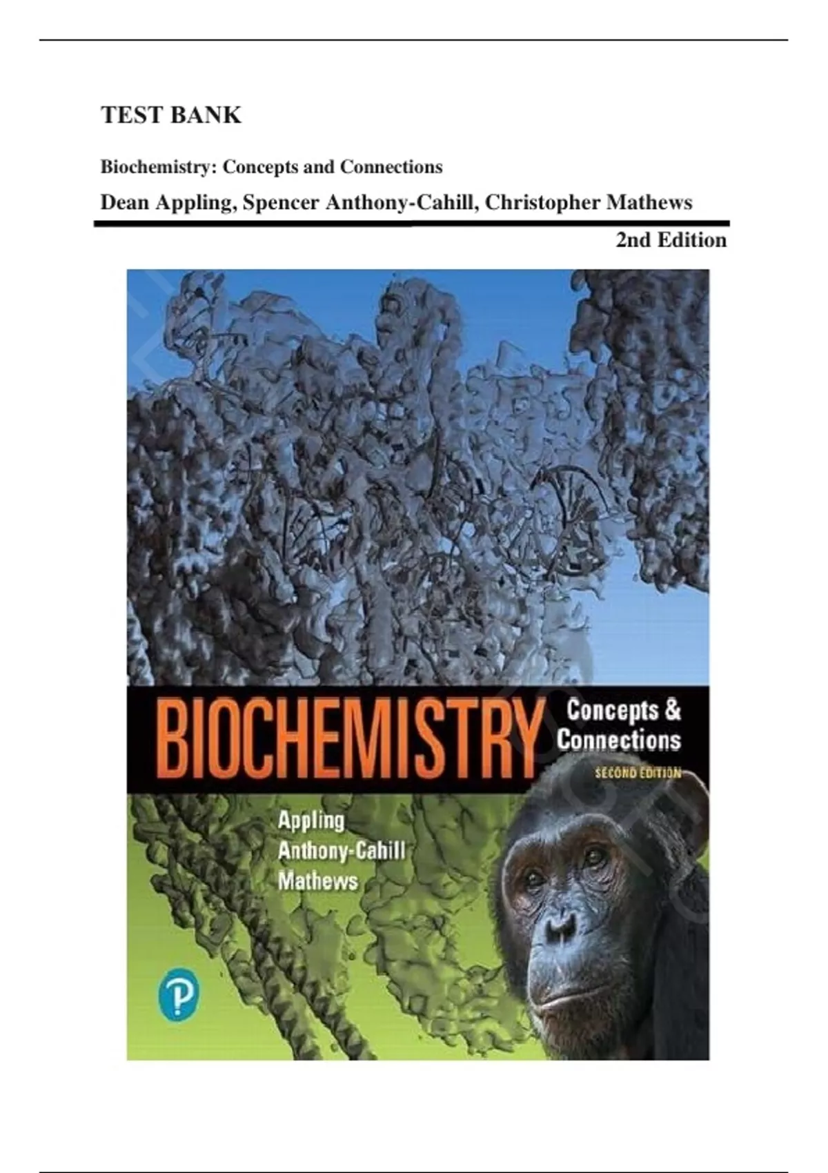Test Bank - Biochemistry: Concepts and Connections, 2nd Edition (Appling, 2019) Chapter 1-26 | All Chapters. Table of Contents Biochemistry and the Language of Chemistry The Chemical Foundation of Life: Weak Interactions in an Aqueous Environment The Energetics of Life Nucleic Acids Introduction to Proteins: The Primary Level of Protein Structure The Three-Dimensional Structure of Proteins Protein Function and Evolution Enzymes: Biological Catalysts Carbohydrates: Sugars, Saccharides, Glycans Lipids, Membranes, and Cellular Transport Chemical Logic of Metabolism Carbohydrate Metabolism: Glycolysis, Gluconeogenesis, Glycogen Metabolism, and the Pentose Phosphate Pathway The Citric Acid Cycle Electron Transport, Oxidative Phosphorylation, and Oxygen Metabolism Photosynthesis Lipid Metabolism Interorgan and Intracellular Coordination of Energy Metabolism in Vertebrates Amino Acid and Nitrogen Metabolism Nucleotide Metabolism Mechanisms of Signal Transduction Genes, Genomes, and Chromosomes DNA Replication DNA Repair, Recombination, and Rearrangement Transcription and Post-transcriptional Processing Information Decoding: Translation and Post-translational Protein Processing Regulation of Gene Expression