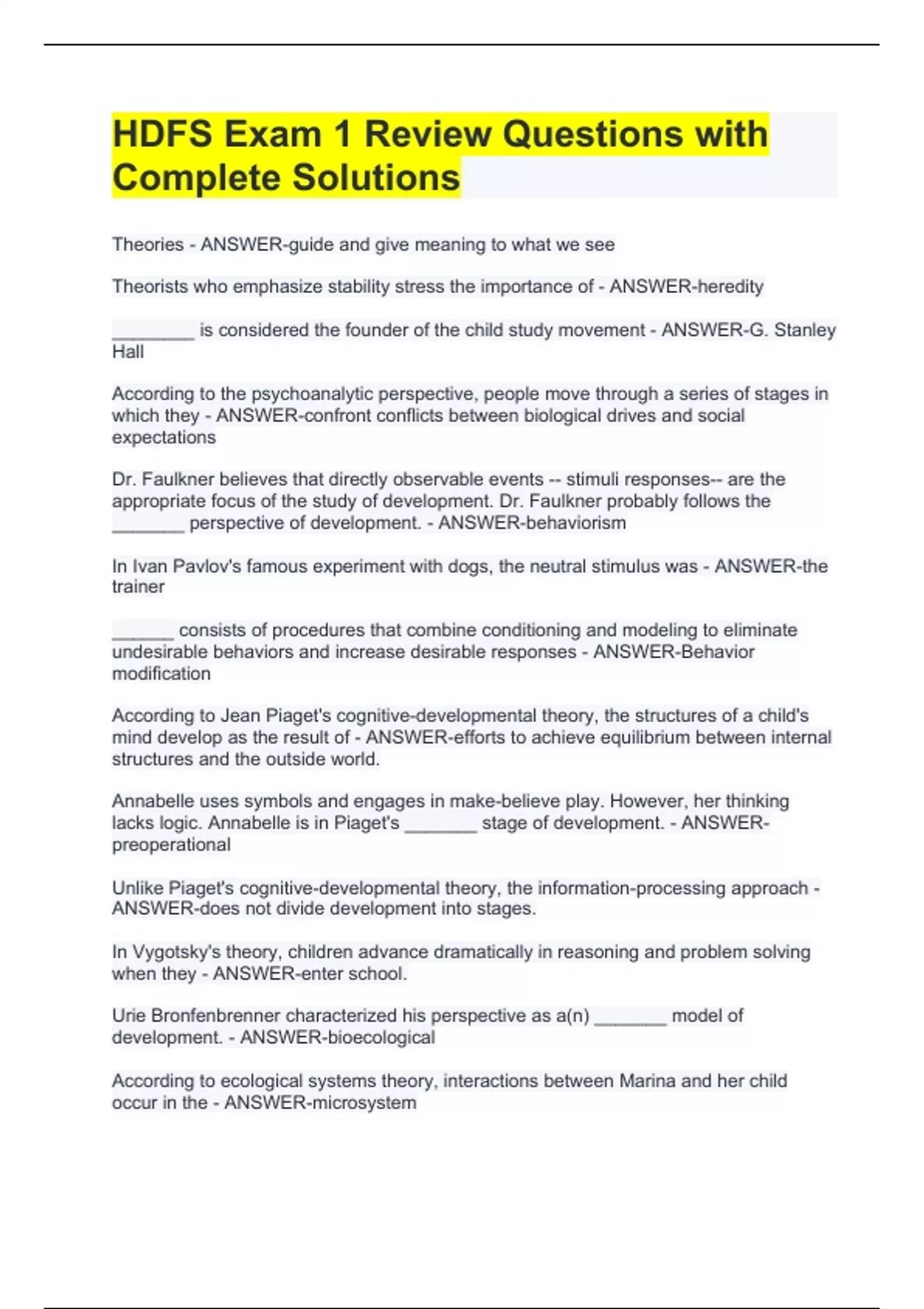Theories - ANSWER-guide and give meaning to what we see Theorists who emphasize stability stress the importance of - ANSWER-heredity ________ is considered the founder of the child study movement - ANSWER-G. Stanley Hall According to the psychoanalytic perspective, people move through a series of stages in which they - ANSWER-confront conflicts between biological drives and social expectations Dr. Faulkner believes that directly observable events -- stimuli responses-- are the appropriate focus of the study of development. Dr. Faulkner probably follows the _______ perspective of development. - ANSWER-behaviorism In Ivan Pavlov's famous experiment with dogs, the neutral stimulus was - ANSWER-the trainer ______ consists of procedures that combine conditioning and modeling to eliminate undesirable behaviors and increase desirable responses - ANSWER-Behavior modification According to Jean Piaget's cognitive-developmental theory, the structures of a child's mind develop as the result of - ANSWER-efforts to achieve equilibrium between internal structures and the outside world. Annabelle uses symbols and engages in make-believe play. However, her thinking lacks logic. Annabelle is in Piaget's _______ stage of development. - ANSWER-preoperational Unlike Piaget's cognitive-developmental theory, the information-processing approach - ANSWER-does not divide development into stages. In Vygotsky's theory, children advance dramatically in reasoning and problem solving when they - ANSWER-enter school. Urie Bronfenbrenner characterized his perspective as a(n) _______ model of development. - ANSWER-bioecological According to ecological systems theory, interactions between Marina and her child occur in the - ANSWER-microsystem
