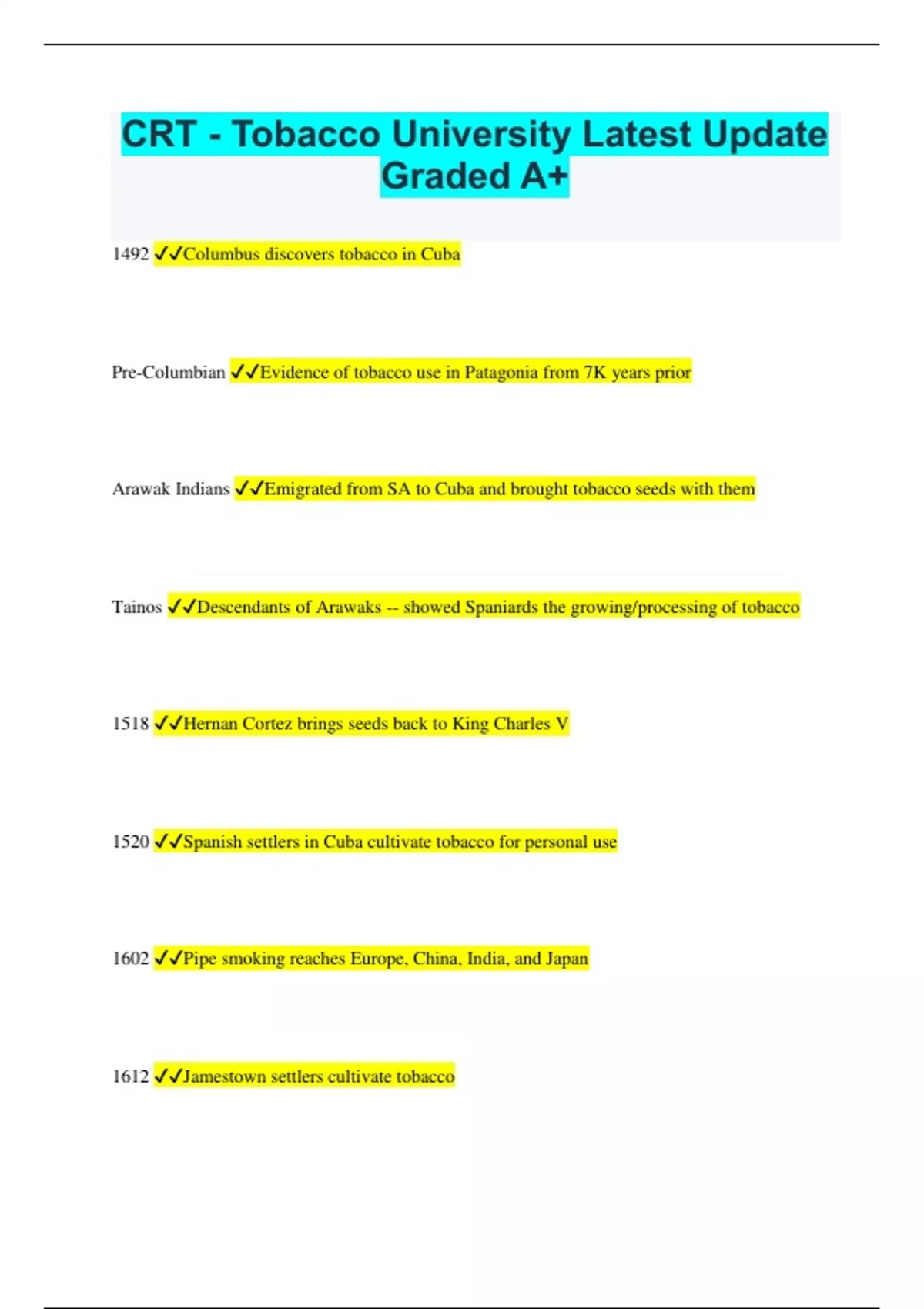 CRT - Tobacco University Latest Update Graded A+ 1492 Columbus discovers tobacco in Cuba Pre-Columbian Evidence of tobacco use in Patagonia from 7K years prior Arawak Indians Emigrated from SA to Cuba and brought tobacco seeds with them Tainos Descendants of Arawaks -- showed Spaniards the growing/processing of tobacco 1518 Hernan Cortez brings seeds back to King Charles V 1520 Spanish settlers in Cuba cultivate tobacco for personal use 1602 Pipe smoking reaches Europe, China, India, and Japan 1612 Jamestown settlers cultivate tobacco - John Rolfe first to grow tobacco commercially for export 1676 the "Cigar" is born in Sevilla Spain 1700s Cigar factories sprout up all across Europe 1817 King Ferdinand VII made the production/sale of tobacco a legal endeavor in Cuba -Cigar production had been illegal for taxation and control purposes 1827 Don Jaime Partagas establishes Flor de Tobacos Partages y Compania 1830s Beginning of cigar bands 1850 Dutch merchants Gustave Bock marks his cigars with a paper band 1920s Cigar rolling machine is introduced in America 1959 Cuban Revolution instigates an exodus of Cuban cigar makers to Canary islands, DR, Central America, and US Indian Medicinal Use of Tobacco for: -Religious purposes -Healing open wounds -Toothaches and headaches -Reduced hunger/increased alertness Alkaloid Nicotine - produces physiological effects Biphasic Nicotine effects mental alertness and physical relaxation (contradictory effects) Nicotine protects against: -Alzheimers -Parkinsons -Tourettes -ADHD