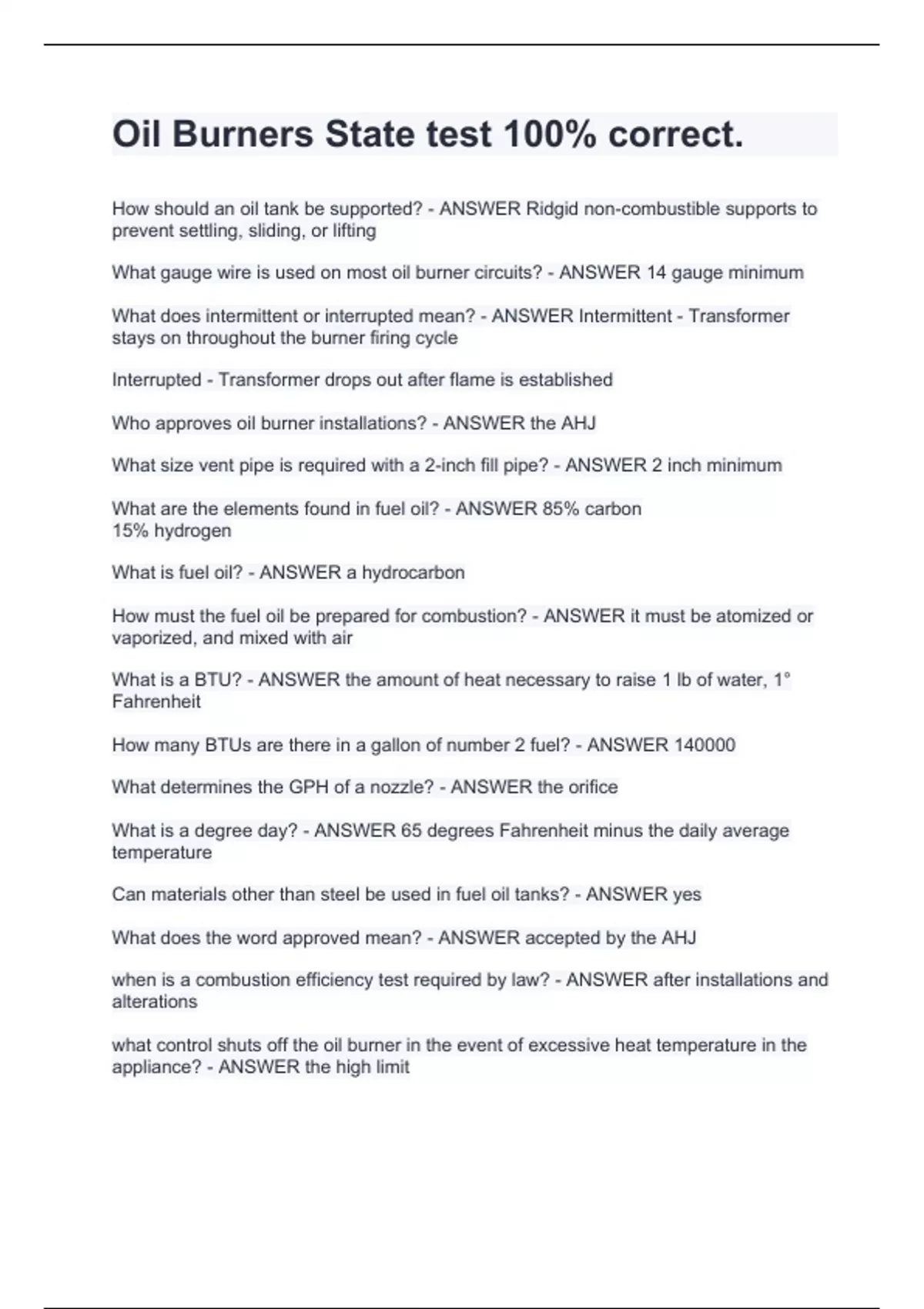 How should an oil tank be supported? - ANSWER Ridgid non-combustible supports to prevent settling, sliding, or lifting What gauge wire is used on most oil burner circuits? - ANSWER 14 gauge minimum What does intermittent or interrupted mean? - ANSWER Intermittent - Transformer stays on throughout the burner firing cycle Interrupted - Transformer drops out after flame is established Who approves oil burner installations? - ANSWER the AHJ What size vent pipe is required with a 2-inch fill pipe? - ANSWER 2 inch minimum What are the elements found in fuel oil? - ANSWER 85% carbon 15% hydrogen What is fuel oil? - ANSWER a hydrocarbon How must the fuel oil be prepared for combustion? - ANSWER it must be atomized or vaporized, and mixed with air What is a BTU? - ANSWER the amount of heat necessary to raise 1 lb of water, 1° Fahrenheit How many BTUs are there in a gallon of number 2 fuel? - ANSWER 140000 What determines the GPH of a nozzle? - ANSWER the orifice What is a degree day? - ANSWER 65 degrees Fahrenheit minus the daily average temperature Can materials other than steel be used in fuel oil tanks? - ANSWER yes What does the word approved mean? - ANSWER accepted by the AHJ when is a combustion efficiency test required by law? - ANSWER after installations and alterations what control shuts off the oil burner in the event of excessive heat temperature in the appliance? - ANSWER the high limit