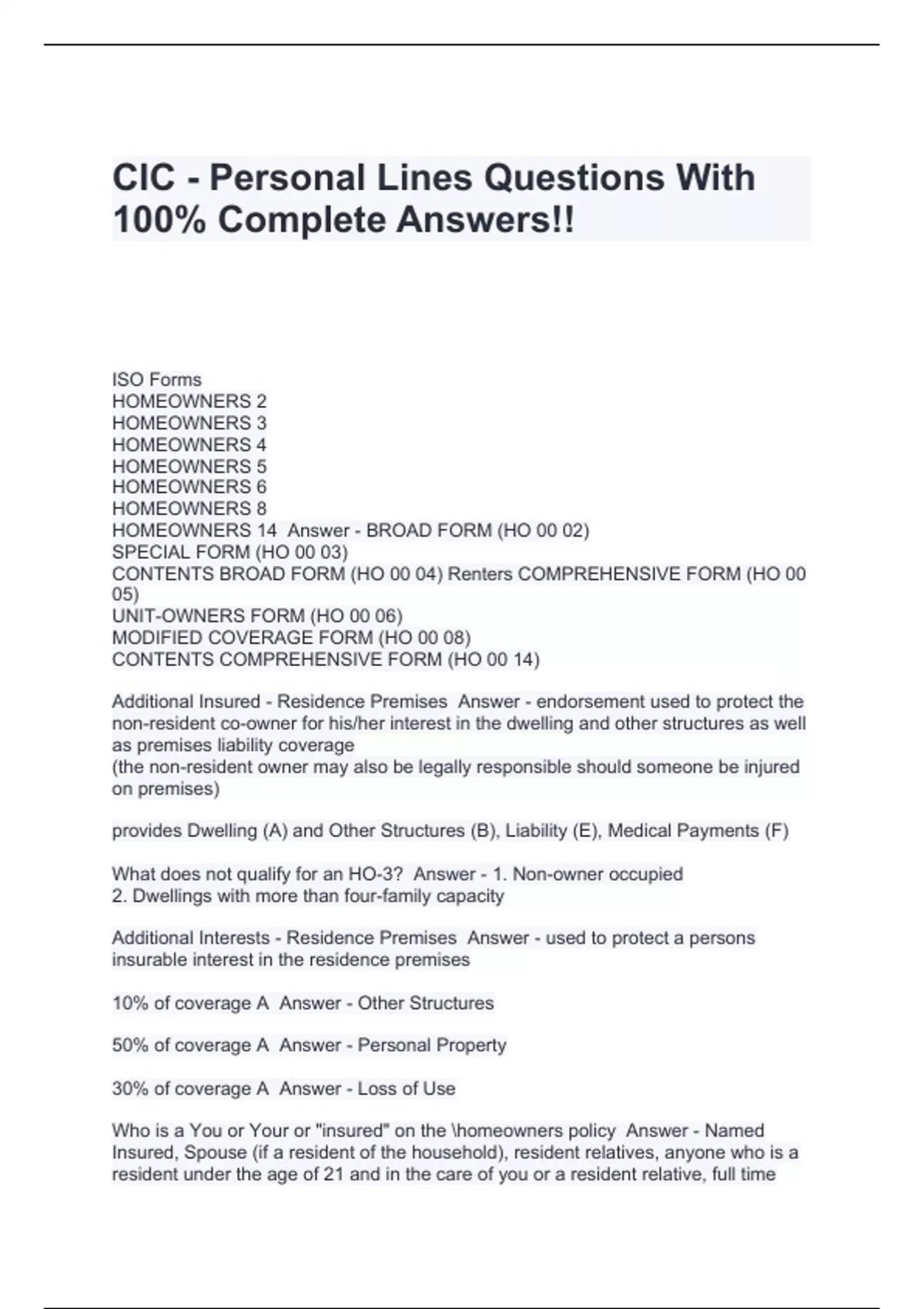 CIC - Personal Lines Questions With 100% Complete Answers!!