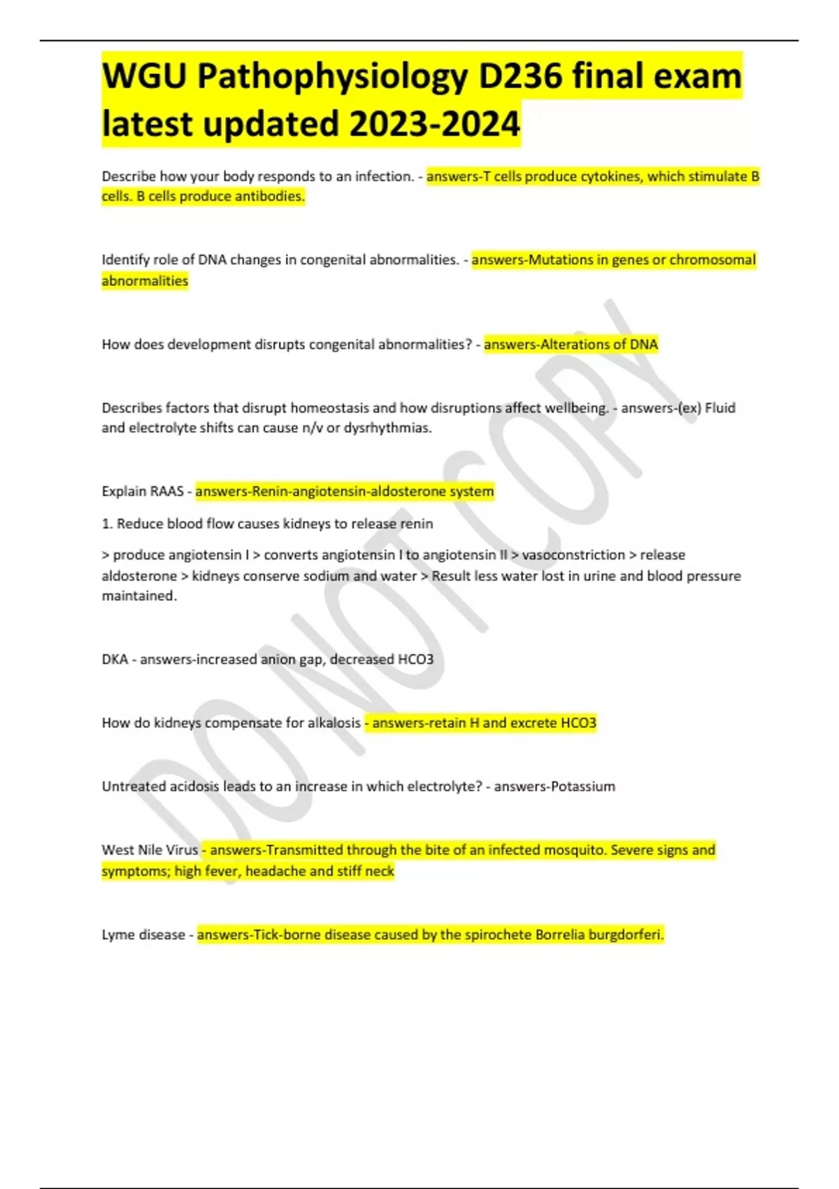 WGU Pathophysiology D236 final exam latest updated Describe how your body responds to an infection. - answers-T cells produce cytokines, which stimulate B cells. B cells produce antibodies. Identify role of DNA changes in congenital abnormalities. - answers-Mutations in genes or chromosomal abnormalities