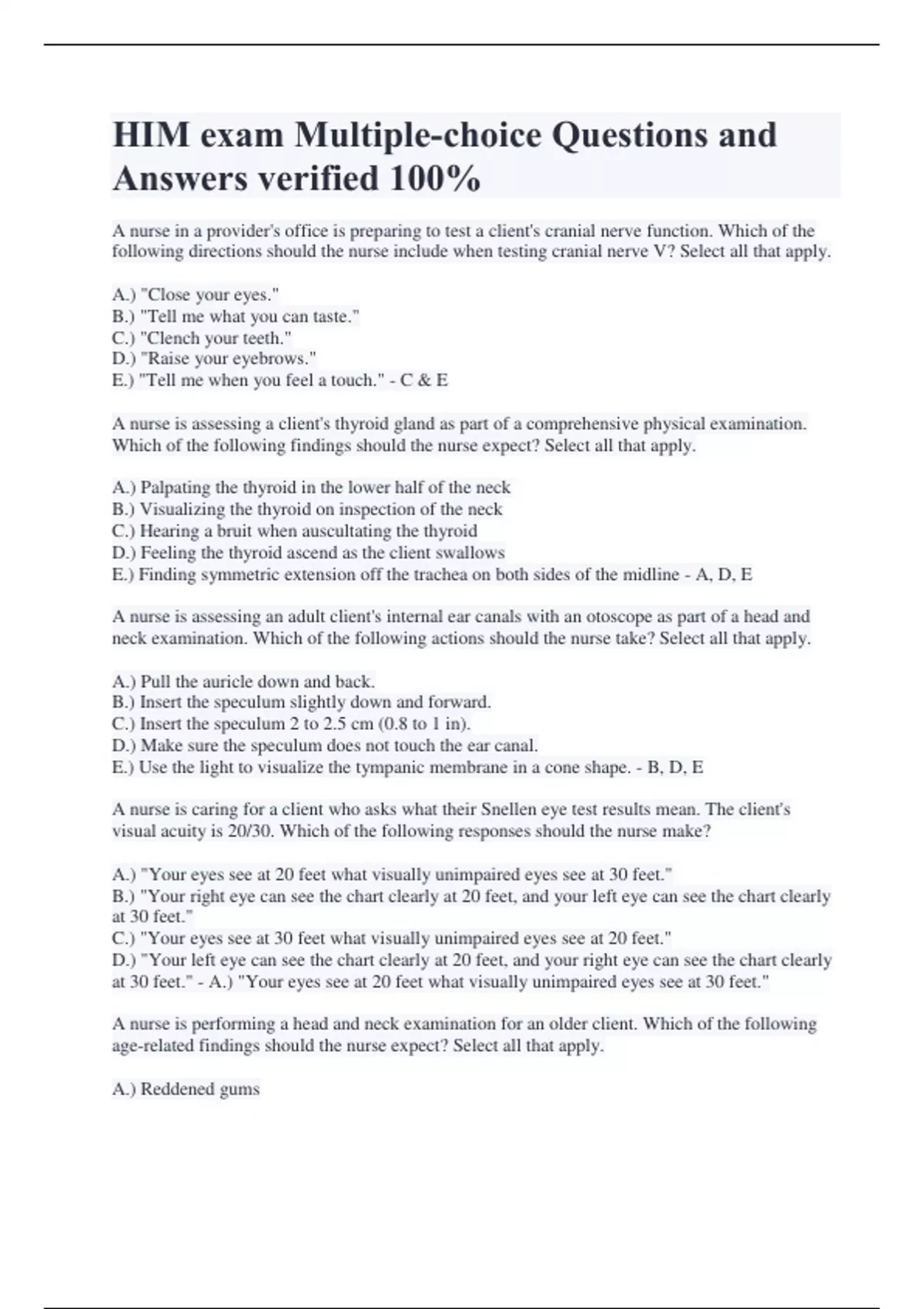 HIM exam Multiple-choice Questions and Answers verified 100% A nurse in a provider's office is preparing to test a client's cranial nerve function. Which of the following directions should the nurse include when testing cranial nerve V? Select all that apply. A.) "Close your eyes." B.) "Tell me what you can taste." C.) "Clench your teeth." D.) "Raise your eyebrows." E.) "Tell me when you feel a touch." - C & E A nurse is assessing a client's thyroid gland as part of a comprehensive physical examination. Which of the following findings should the nurse expect? Select all that apply. A.) Palpating the thyroid in the lower half of the neck B.) Visualizing the thyroid on inspection of the neck C.) Hearing a bruit when auscultating the thyroid D.) Feeling the thyroid ascend as the client swallows E.) Finding symmetric extension off the trachea on both sides of the midline - A, D, E A nurse is assessing an adult client's internal ear canals with an otoscope as part of a head and neck examination. Which of the following actions should the nurse take? Select all that apply. A.) Pull the auricle down and back. B.) Insert the speculum slightly down and forward. C.) Insert the speculum 2 to 2.5 cm (0.8 to 1 in). D.) Make sure the speculum does not touch the ear canal. E.) Use the light to visualize the tympanic membrane in a cone shape. - B, D, E A nurse is caring for a client who asks what their Snellen eye test results mean. The client's visual acuity is 20/30. Which of the following responses should the nurse make? A.) "Your eyes see at 20 feet what visually unimpaired eyes see at 30 feet." B.) "Your right eye can see the chart clearly at 20 feet, and your left eye can see the chart clearly at 30 feet." C.) "Your eyes see at 30 feet what visually unimpaired eyes see at 20 feet." D.) "Your left eye can see the chart clearly at 20 feet, and your right eye can see the chart clearly at 30 feet." - A.) "Your eyes see at 20 feet what visually unimpaired eyes see at 30 feet." A nurse is performing a head and neck examination for an older client. Which of the following age-related findings should the nurse expect? Select all that apply. A.) Reddened gums B.) Lowered vocal pitch C.) Tooth loss D.) Glare intolerance E.) Thickened eardrums - C, D, E A nurse is caring for a client who had a stroke and has aphasia. Which of the following interventions should the nurse use to promote communication with this client? Select all that apply. A.) Speak at a higher volume to the client. B.) Make sure only one person speaks at a time. C.) Avoid discouraging the client by indicating that they cannot be understood. D.) Allow plenty of time for the client to respond. E.) Use brief sentences with simple words. - B, D, E A nurse is caring for a client who had an amphetamine toxicity and has sensory overload. Which of the following interventions should the nurse implement? A.) Immediately complete a thorough assessment B.) Encourage visitors to distract the client C.) Provide a private room, and limit stimulation D.) Speak at a higher volume to the client - C.) Provide a private room, and limit stimulation A nurse is caring for a client who reports difficulty hearing. Which of the following assessment findings indicate a sensorineural hearing loss in the left ear? Select all that apply. A.) Weber test showing lateralization to the right ear B.) Light reflex at 10 o'clock in the left ear C.) Indications of obstruction in the left ear canal D.) Rinne test showing less time for air and bone conduction E.) Rinne test showing air conduction less than bone conduction in the left ear - A & D A nurse is caring for a client who has several risk factors for hearing loss. Which of the following medications the client currently takes should alert the nurse to a further risk for ototoxicity? Select all that apply. A.) Furosemide B.) Ibuprofen C.) Cimetidine D.) Simvastatin E.) Amiodarone - A & B A nurse is reviewing instructions with a client who has a hearing loss and has just started wearing hearing aids. Which of the following statements should the nurse identify as an indication that the client understands the instructions? A.) "I use a damp cloth to clean the outside part of my hearing aids." B.) "I clean the ear molds of my hearing aids with rubbing alcohol." C.) "I keep the volume of my hearing aids turned up so I can hear better." D.) "I take the batteries out of my hearing aids when I take them off at night." - D.) "I take the batteries out of my hearing aids when I take them off at night." When entering a client's room to change a surgical dressing, a nurse notes that the client is coughing and sneezing. Which of the following actions should the nurse take when preparing the sterile field? A.) Keep the sterile field at least 6 ft away from the client's bedside B.) Instruct the client to refrain from coughing and sneezing during the dressing change C.) Place a mask on the client to limit the spread of microorganisms into the surgical wound D.) Keep a box of facial tissues nearby for the client to use during the dressing change - C.) Place a mask on the client to limit the spread of microorganisms into the surgical wound A nurse has removed a sterile pack from its outside cover and placed it on a clean work surface in preparation for an invasive procedure. Which of the following flaps should the nurse unfold first? A.) The flap closest to the body B.) The right side flap C.) The left side flap D.) The flap farthest from the body - D.) The flap farthest from the body A nurse is wearing sterile gloves in preparation for performing a sterile procedure. Which of the following objects can the nurse touch without breaching sterile technique? Select all that apply. A.) A bottle containing a sterile solution B.) The edge of the sterile drape at the base of the field C.) The inner wrapping of an item on the sterile field D.) An irrigation syringe on the sterile field E.) One gloved hand with the other gloved hand - C, D, E A nurse is r