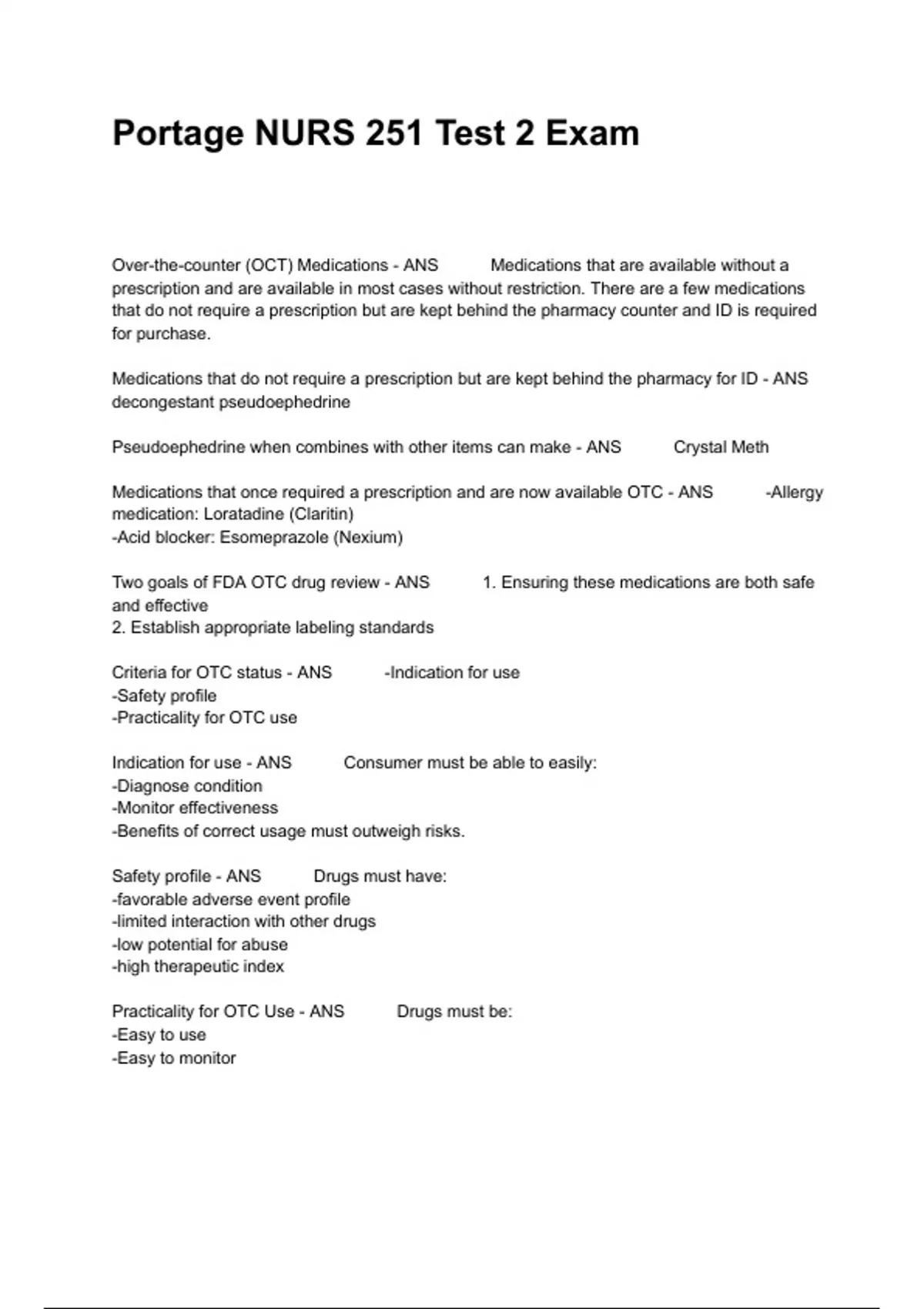 Over-the-counter (OCT) Medications - ANS Medications that are available without a prescription and are available in most cases without restriction. There are a few medications that do not require a prescription but are kept behind the pharmacy counter and ID is required for purchase. Medications that do not require a prescription but are kept behind the pharmacy for ID - ANS decongestant pseudoephedrine Pseudoephedrine when combines with other items can make - ANS Crystal Meth Medications that once required a prescription and are now available OTC - ANS -Allergy medication: Loratadine (Claritin) -Acid blocker: Esomeprazole (Nexium) Two goals of FDA OTC drug review - ANS 1. Ensuring these medications are both safe and effective 2. Establish appropriate labeling standards Criteria for OTC status - ANS -Indication for use -Safety profile -Practicality for OTC use Indication for use - ANS Consumer must be able to easily: -Diagnose condition -Monitor effectiveness -Benefits of correct usage must outweigh risks. Safety profile - ANS Drugs must have: -favorable adverse event profile -limited interaction with other drugs -low potential for abuse -high therapeutic index Practicality for OTC Use - ANS Drugs must be: -Easy to use -Easy to monitor Many OTC medications may cause harm in patients with - ANS diseases such as diabetes, hypertension, cardiovascular disease, and glaucoma.