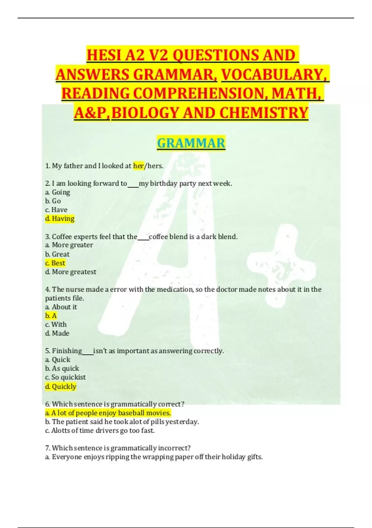 HESI A2 V2 QUESTIONS AND ANSWERS GRAMMAR, VOCABULARY, READING COMPREHENSION, MATH, A&P,BIOLOGY AND CHEMISTRY
