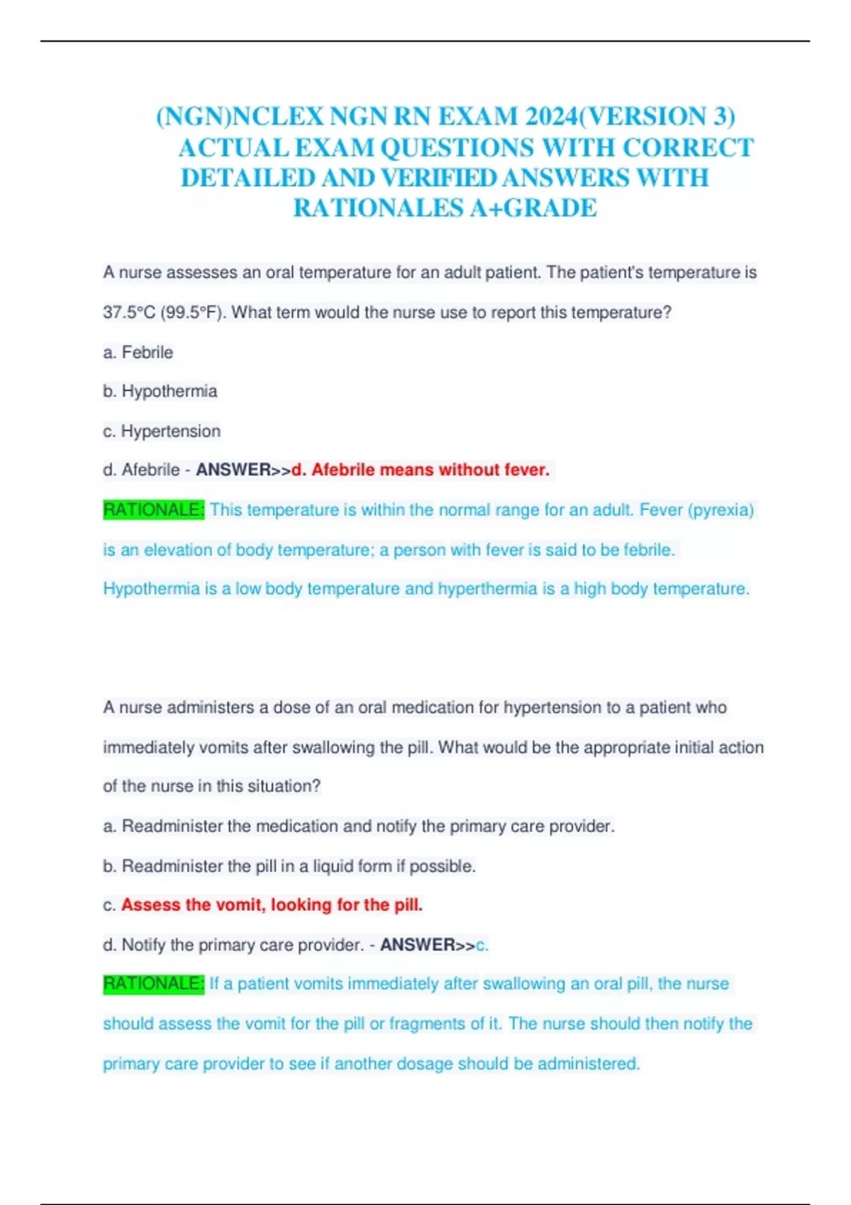 (NGN)NCLEX NGN RN EXAM 2024(VERSION 3) ACTUAL EXAM QUESTIONS WITH CORRECT DETAILED AND VERIFIED ANSWERS WITH RATIONALES A+GRADE