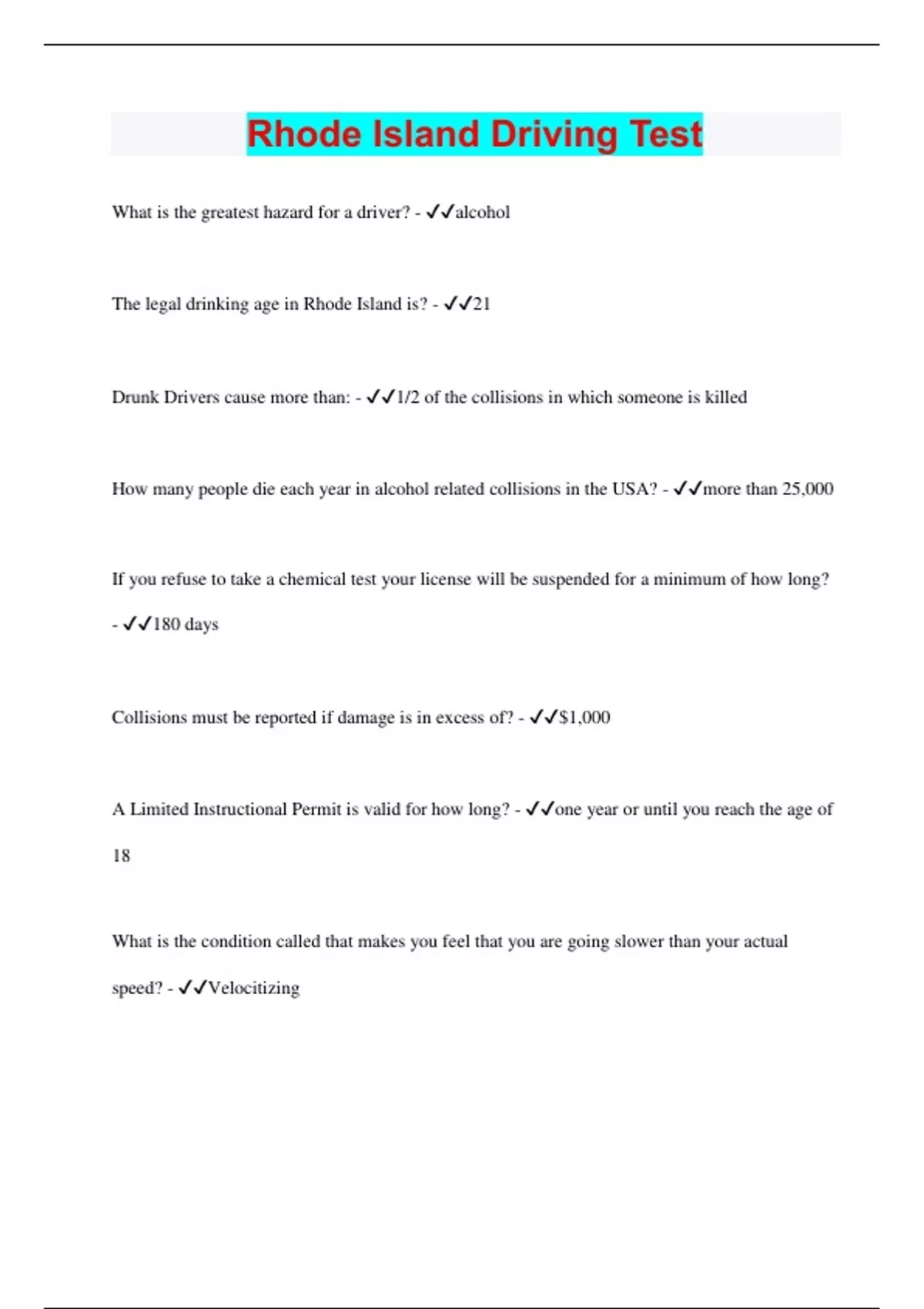 Rhode Island Driving Test What is the greatest hazard for a driver? - alcohol The legal drinking age in Rhode Island is? - 21 Drunk Drivers cause more than: - 1/2 of the collisions in which someone is killed How many people die each year in alcohol related collisions in the USA? - more than 25,000 If you refuse to take a chemical test your license will be suspended for a minimum of how long? - 180 days Collisions must be reported if damage is in excess of? - $1,000 A Limited Instructional Permit is valid for how long? - one year or until you reach the age of 18 What is the condition called that makes you feel that you are going slower than your actual speed? - Velocitizing What is the condition called that can be caused by long periods of driving? - highway hypnosis When parking UP HILL with a CURB you should always do what? - turn your wheels to the left The blind spot behind a large truck is? - over 50 feet long If you expect a truck driver to see you, how far back should you stay behind it? - 50 feet back With a Limited Provisional License you cannot drive without supervision between 1:00AM and 5:00AM unless: - driving to or from work or a volunteer firefighter activity To obtain a Full Operator's License you must? - Be at least 17 and 6 months old, have held a limited provisional license, have not been convicted of a motor vehicle moving violation or safety belt infraction during the previous 6 months. Most vehicle collisions are caused by? - Human error and speeding What is the average driver's reaction time? - 3/4 of a second Who has the right of way at an intersection that does not have traffic control lights? - The vehicle approaching you on the right When leaving a traffic lane to enter a parking space you must? - use a turn signal and move into the traffic lane closest to the parking space You cannot park within how many feet of a fire hydrant? - 8 feet You cannot park within how many feet of a crosswalk at an intersection? - 20 feet You must use hand signals/directional lights at least how many feet prior to making a turn? - 100 feet at a minimum When does the law require headlights to be turned on? - From sunset to sunrise, in rain and/or in snow, and when windshield wipers are in use. The speed limit in a residential area is? - 25mph The current BAC set by Rhode Island law is? - .02% for anyone under 21 and .08% for any persons over 21