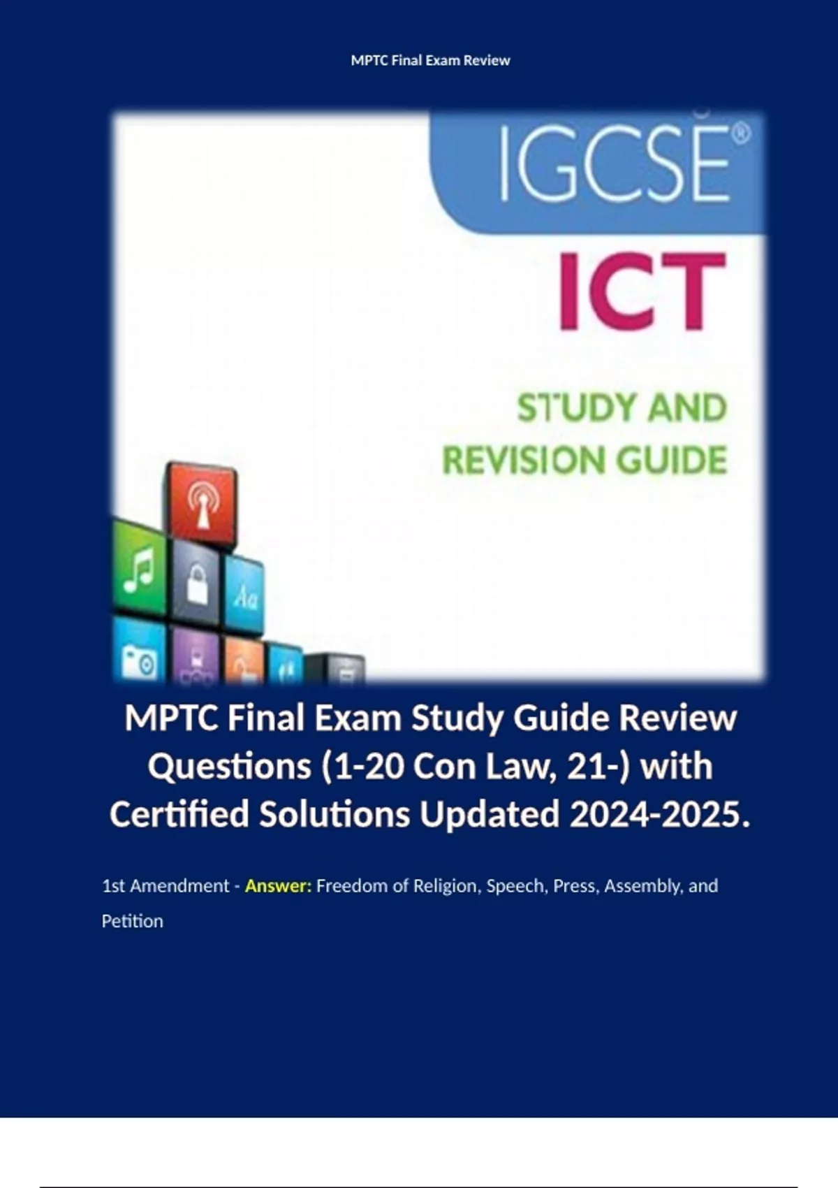 MPTC Final Exam Study Guide Review Questions (1-20 Con Law, 21-) with Certified Solutions Updated . Terms like: 1st Amendment - Answer: Freedom of Religion, Speech, Press, Assembly, and Petition