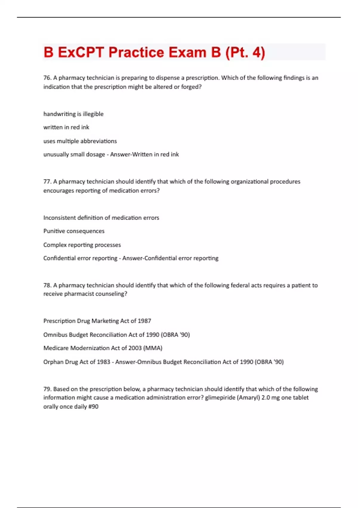 76. A pharmacy technician is preparing to dispense a prescription. Which of the following findings is an indication that the prescription might be altered or forged? handwriting is illegible written in red ink uses multiple abbreviations unusually small dosage - Answer-Written in red ink 77. A pharmacy technician should identify that which of the following organizational procedures encourages reporting of medication errors? Inconsistent definition of medication errors Punitive consequences Complex reporting processes Confidential error reporting - Answer-Confidential error reporting 78. A pharmacy technician should identify that which of the following federal acts requires a patient to receive pharmacist counseling? Prescription Drug Marketing Act of 1987 Omnibus Budget Reconciliation Act of 1990 (OBRA '90) Medicare Modernization Act of 2003 (MMA) Orphan Drug Act of 1983 - Answer-Omnibus Budget Reconciliation Act of 1990 (OBRA '90) 79. Based on the prescription below, a pharmacy technician should identify that which of the following information might cause a medication administration error? glimepiride (Amaryl) 2.0 mg one tablet orally once daily #90The prescriber should use the abbreviation "QD" for "once daily" The strength of 2.0 mg should be written as 2 mg The word "orally" should be replaced with "po" The prescriber should be spell out #90 for the quantity - Answer-The strength of 2.0 mg should be written as 2 mg 80. A pharmacy technician should assign which of the following expiration dates to a magic mouthwash that contains water? 7 days 14 days 30 days 60 days - Answer-14 days 81. A pharmacy technician should use a vertical airflow hood to compound which of the following types of medications? IV piggyback Chemotherapy Total parenteral nutrition Nuclear - Answer-Chemotherapy 82. According to federal law, when transferring a Schedule II medication to another pharmacy, which of the following forms should the pharmacy complete and retain? DEA Form 222 DEA Form 41 DEA Form 106 DEA Form 225 - Answer-DEA Form 222
