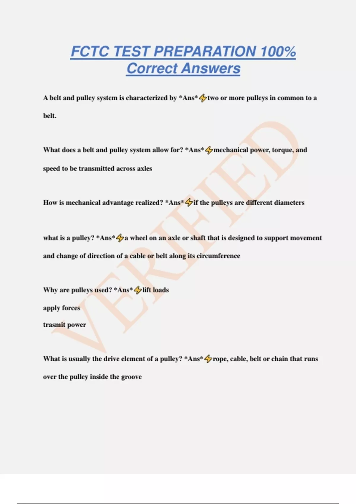 FCTC TEST PREPARATION 100% Correct Answers A belt and pulley system is characterized by *Ans* two or more pulleys in common to a belt. What does a belt and pulley system allow for? *Ans* mechanical power, torque, and speed to be transmitted across axles How is mechanical advantage realized? *Ans* if the pulleys are different diameters what is a pulley? *Ans* a wheel on an axle or shaft that is designed to support movement and change of direction of a cable or belt along its circumference Why are pulleys used? *Ans* lift loads apply forces trasmit power What is usually the drive element of a pulley? *Ans* rope, cable, belt or chain that runs over the pulley inside the groove