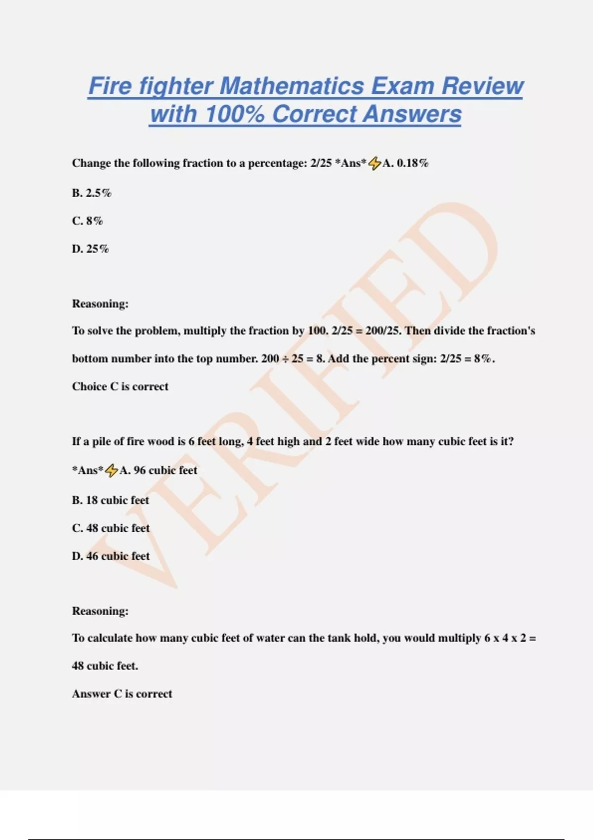 Fire fighter Mathematics Exam Review with 100% Correct Answers Change the following fraction to a percentage: 2/25 *Ans* A. 0.18% B. 2.5% C. 8% D. 25% Reasoning: To solve the problem, multiply the fraction by 100. 2/25 = 200/25. Then divide the fraction's bottom number into the top number. 200 ÷ 25 = 8. Add the percent sign: 2/25 = 8%. Choice C is correct If a pile of fire wood is 6 feet long, 4 feet high and 2 feet wide how many cubic feet is it? *Ans* A. 96 cubic feet B. 18 cubic feet C. 48 cubic feet D. 46 cubic feet Reasoning: To calculate how many cubic feet of water can the tank hold, you would multiply 6 x 4 x 2 = 48 cubic feet. Answer C is correct Flooring in an older house has three layers of plywood. Each layer is a different thickness. One layer is 1/2 inch thick, a second layer is 3/8 inch thick and the total thickness is 1 3/4 inches. What is the width of the third layer? *Ans* A. 7/8 inch B. 1/2 inch C. 3/8 inch D. 7/16 inch Reasoning: First, find the common denominator = 8. Then convert all fractions: 1/2 = 4/8, 3/8 = 3/8, 1 3/4 = 14/8. Add the first and second layer and then subtract the sum from the total thickness: 4/8 + 3/8 = 7/8. 14/8 - 7/8 = 7/8 inch. Choice A is correct Water container A holds 150 gallons of water when full. Water container B, holds 270 gallons of water when full. If water container A is only 3/4 full and water container B is only 1/3 full, how many more gallons of water are needed to fill both container to their limit? *Ans* A. 225 gallons B. 217.5 gallons C. 250 gallons D. 215.5 gallon