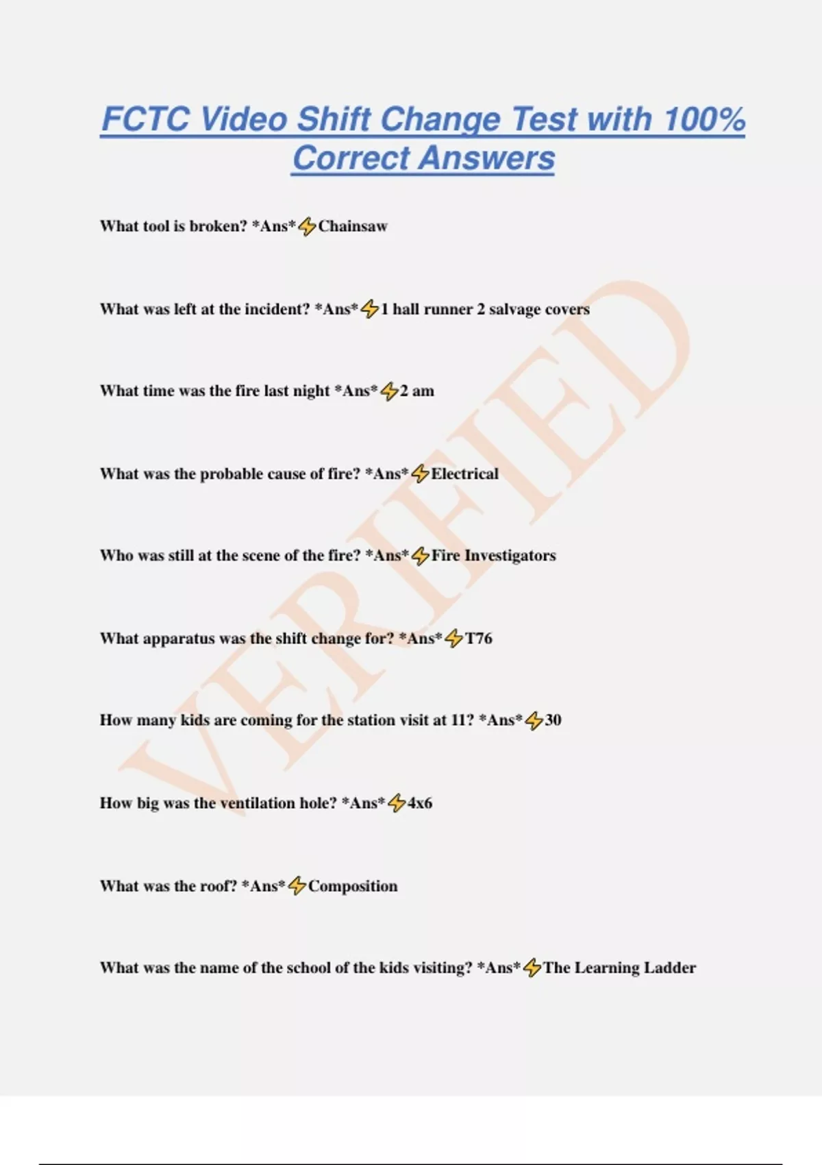 FCTC Video Shift Change Test with 100% Correct Answers What tool is broken? *Ans* Chainsaw What was left at the incident? *Ans* 1 hall runner 2 salvage covers What time was the fire last night *Ans* 2 am What was the probable cause of fire? *Ans* Electrical Who was still at the scene of the fire? *Ans* Fire Investigators What apparatus was the shift change for