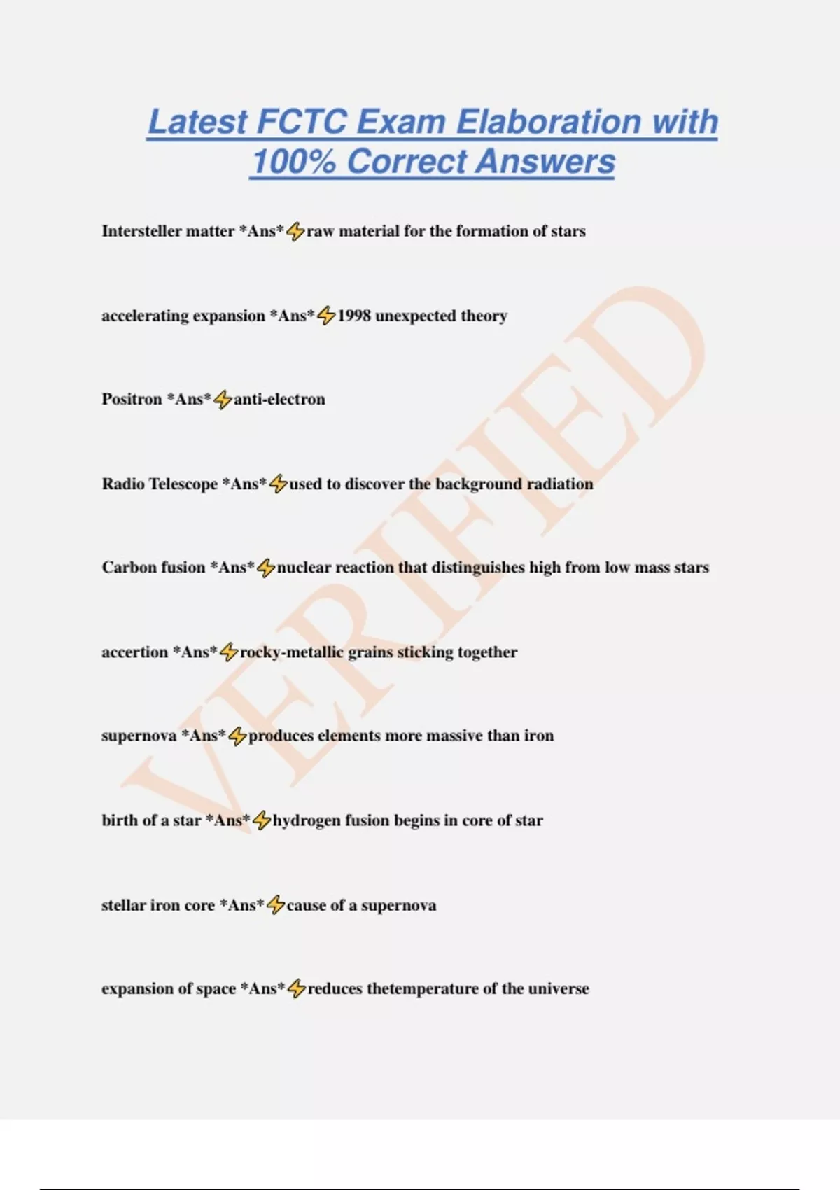 Latest FCTC Exam Elaboration with 100% Correct Answers Intersteller matter *Ans* raw material for the formation of stars accelerating expansion *Ans* 1998 unexpected theory Positron *Ans* anti-electron Radio Telescope *Ans* used to discover the background radiation Carbon fusion *Ans* nuclear reaction that distinguishes high from low mass stars accertion *Ans* rocky-metallic grains sticking together supernova *Ans* produces elements more massive than iron birth of a star *Ans* hydrogen fusion begins in core of star stellar iron core *Ans* cause of a supernova expansion of space *Ans* reduces thetemperature of the universe exponential decay *Ans* used to determine the age of the earth neutrino *Ans* small-mass neutral particle helium-4 *Ans* nucleus produced in hydrogen fusion steady state theory *Ans* assumes universe is infinitely old radioactivity *Ans* source of energy to melt earth's in