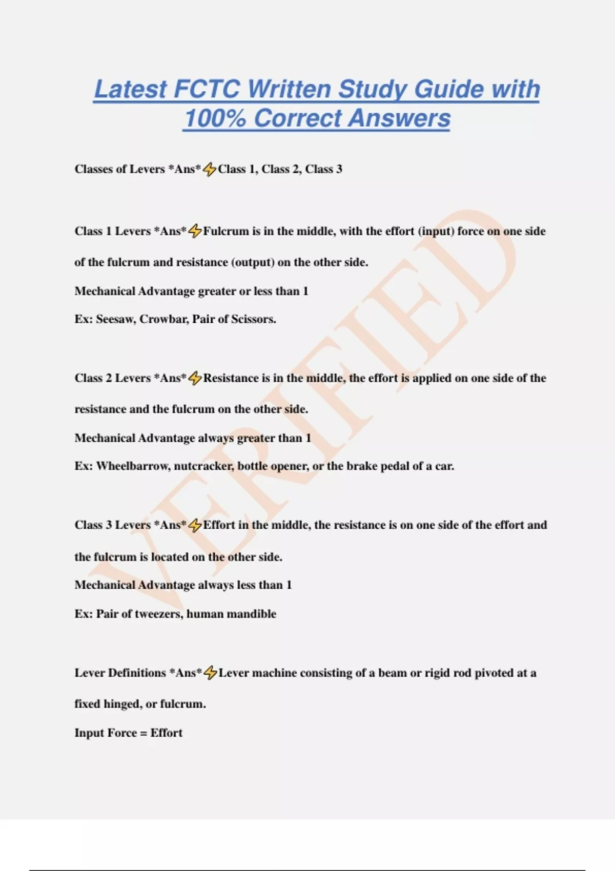 Latest FCTC Written Study Guide with 100% Correct Answers Classes of Levers *Ans* Class 1, Class 2, Class 3 Class 1 Levers *Ans* Fulcrum is in the middle, with the effort (input) force on one side of the fulcrum and resistance (output) on the other side. Mechanical Advantage greater or less than 1 Ex: Seesaw, Crowbar, Pair of Scissors. Class 2 Levers *Ans* Resistance is in the middle, the effort is applied on one side of the resistance and the fulcrum on the other side. Mechanical Advantage always greater than 1 Ex: Wheelbarrow, nutcracker, bottle opener, or the brake pedal of a car. Class 3 Levers *Ans* Effort in the middle, the resistance is on one side of the effort and the fulcrum is located on the other side. Mechanical Advantage always less than 1 Ex: Pair of tweezers, human mandible Lever Definitions *Ans* Lever machine consisting of a beam or rigid rod pivoted at a fixed hinged, or fulcrum. Input Force = Effort Output Force = Load or Resistanc