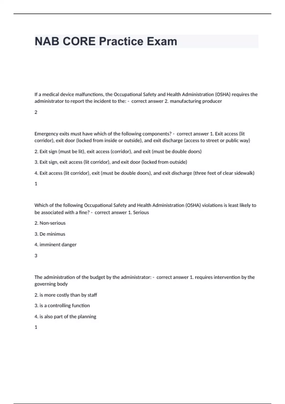 If a medical device malfunctions, the Occupational Safety and Health Administration (OSHA) requires the administrator to report the incident to the: - correct answer 2. manufacturing producer 2 Emergency exits must have which of the following components? - correct answer 1. Exit access (lit corridor), exit door (locked from inside or outside), and exit discharge (access to street or public way) 2. Exit sign (must be lit), exit access (corridor), and exit (must be double doors) 3. Exit sign, exit access (lit corridor), and exit door (locked from outside) 4. Exit access (lit corridor), exit (must be double doors), and exit discharge (three feet of clear sidewalk) 1 Which of the following Occupational Safety and Health Administration (OSHA) violations is least likely to be associated with a fine? - correct answer 1. Serious 2. Non-serious 3. De minimus 4. imminent danger 3 The administration of the budget by the administrator: - correct answer 1. requires intervention by the governing body 2. is more costly than by staff 3. is a controlling function 4. is also part of the planning
