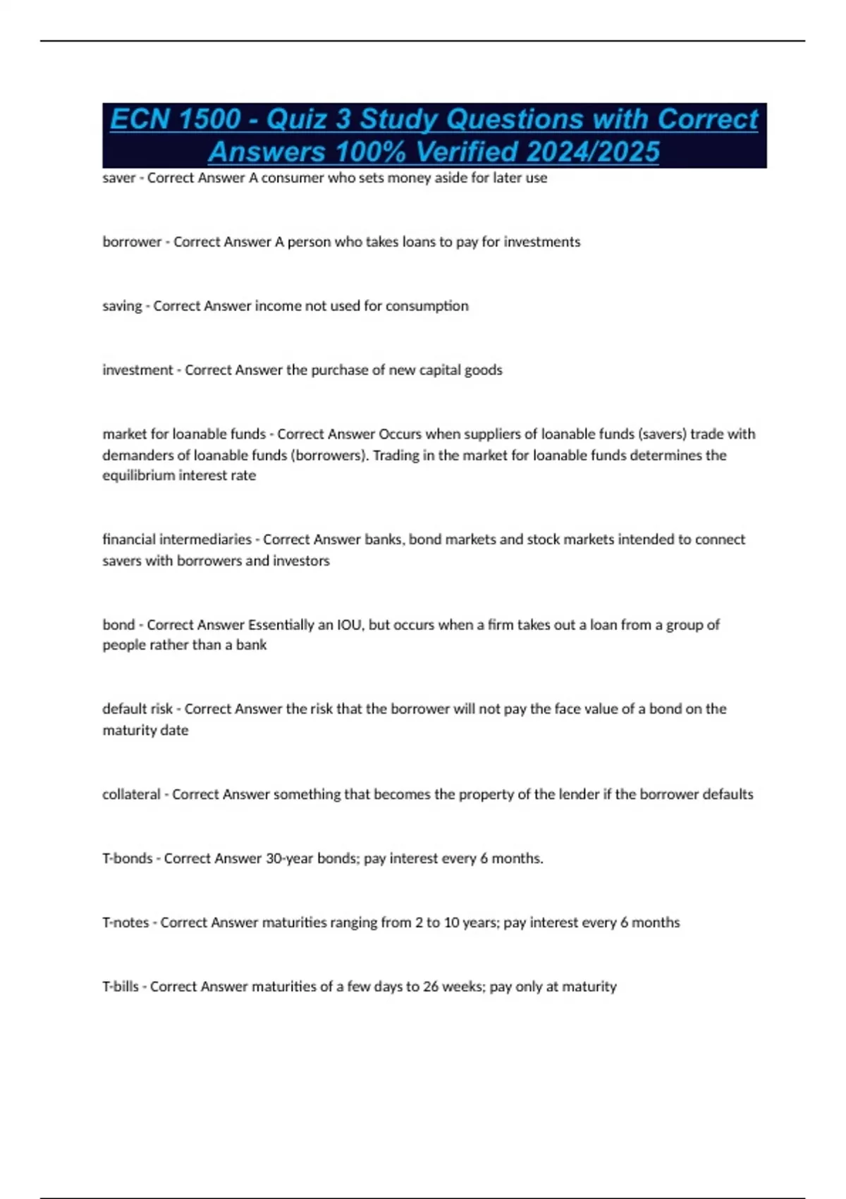 ECN 1500 - Quiz 3 Study Questions with Correct Answers 100% Verified 2024/2025 saver - Correct Answer A consumer who sets money aside for later use borrower - Correct Answer A person who takes loans to pay for investments saving - Correct Answer income not used for consumption investment - Correct Answer the purchase of new capital goods market for loanable funds - Correct Answer Occurs when suppliers of loanable funds (savers) trade with demanders of loanable funds (borrowers). Trading in the market for loanable funds determines the equilibrium interest rate financial intermediaries - Correct Answer banks, bond markets and stock markets intended to connect savers with borrowers and investors bond - Correct Answer Essentially an IOU, but occurs when a firm takes out a loan from a group of people rather than a bank default risk - Correct Answer the risk that the borrower will not pay the face value of a bond on the maturity date collateral - Correct Answer something that becomes the property of the lender if the borrower defaults T-bonds - Correct Answer 30-year bonds; pay interest every 6 months. T-notes - Correct Answer maturities ranging from 2 to 10 years; pay interest every 6 months T-bills - Correct Answer maturities of a few days to 26 weeks; pay only at maturity