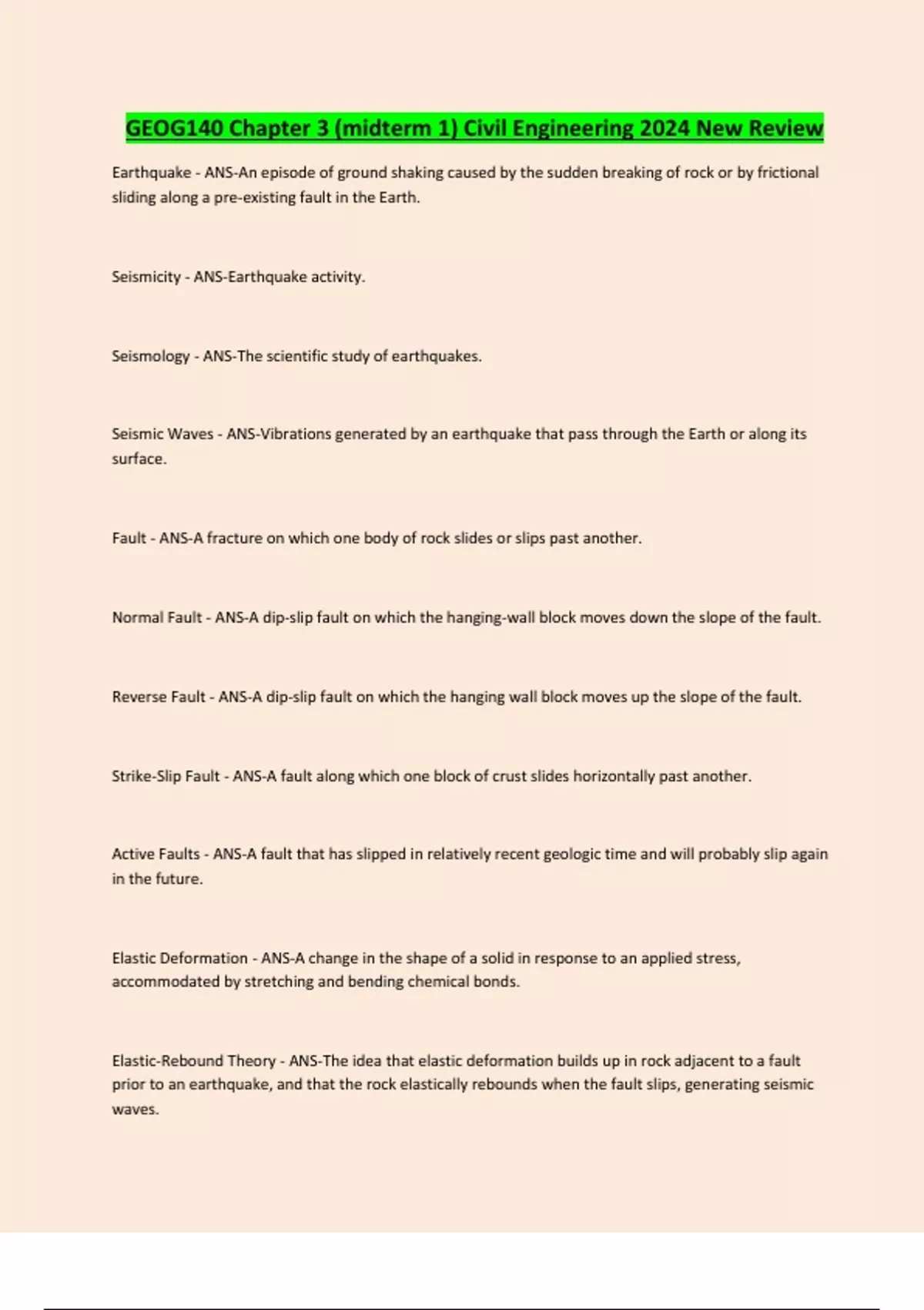 GEOG140 Chapter 3 (midterm 1) Civil Engineering 2024 New Review Earthquake - ANS-An episode of ground shaking caused by the sudden breaking of rock or by frictional sliding along a pre-existing fault in the Earth. Seismicity - ANS-Earthquake activity. Seismology - ANS-The scientific study of earthquakes. Seismic Waves - ANS-Vibrations generated by an earthquake that pass through the Earth or along its surface. Fault - ANS-A fracture on which one body of rock slides or slips past another. Normal Fault - ANS-A dip-slip fault on which the hanging-wall block moves down the slope of the fault. Reverse Fault - ANS-A dip-slip fault on which the hanging wall block moves up the slope of the fault. Strike-Slip Fault - ANS-A fault along which one block of crust slides horizontally past another. Active Faults - ANS-A fault that has slipped in relatively recent geologic time and will probably slip again in the future. Elastic Deformation - ANS-A change in the shape of a solid in response to an applied stress, accommodated by stretching and bending chemical bonds. Elastic-Rebound Theory - ANS-