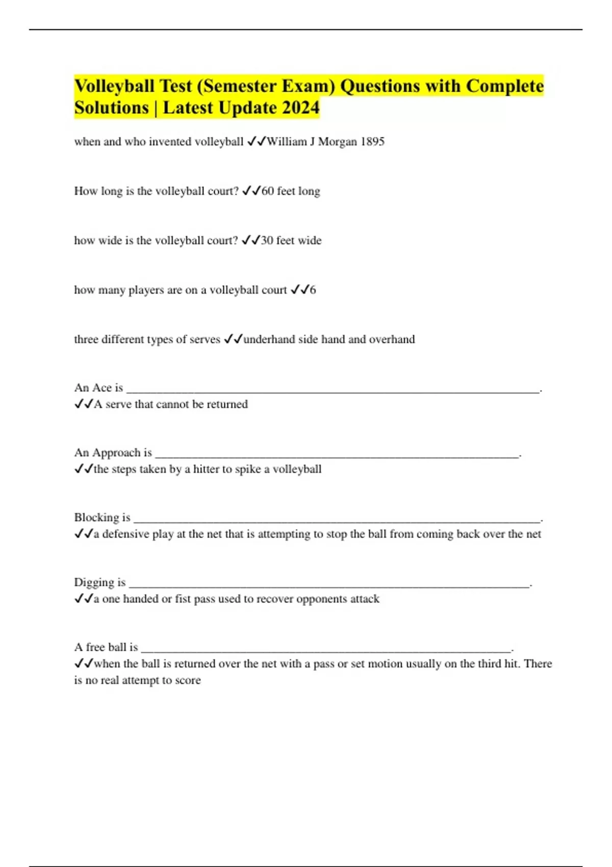 Volleyball Test (Semester Exam) Questions with Complete Solutions | Latest Update 2024