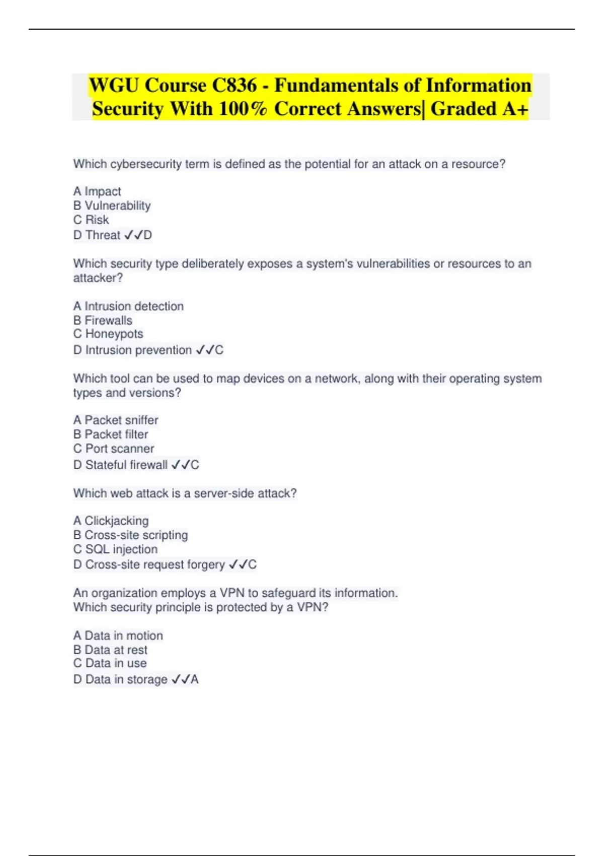 Which cybersecurity term is defined as the potential for an attack on a resource? A Impact B Vulnerability C Risk D Threat D Which security type deliberately exposes a system's vulnerabilities or resources to an attacker? A Intrusion detection B Firewalls C Honeypots D Intrusion prevention C Which tool can be used to map devices on a network, along with their operating system types and versions? A Packet sniffer B Packet filter C Port scanner D Stateful firewall C Which web attack is a server-side attack? A Clickjacking B Cross-site scripting C SQL injection D Cross-site request forgery C An organization employs a VPN to safeguard its information. Which security principle is protected by a VPN? A Data in motion B Data at rest C Data in use D Data in storage AA malicious hacker was successful in a denial of service (DoS) attack against an institution's mail server. Fortunately, no data was lost or altered while the server was offline. Which type of attack is this?