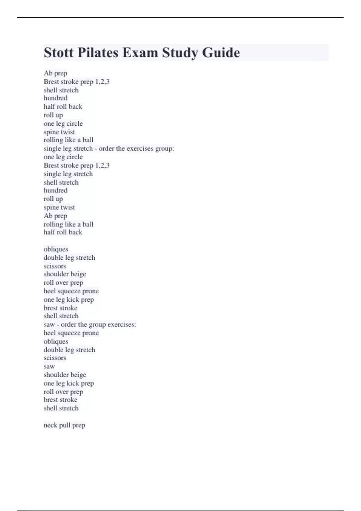 Stott Pilates Exam Study Guide Ab prep Brest stroke prep 1,2,3 shell stretch hundred half roll back roll up one leg circle spine twist rolling like a ball single leg stretch - order the exercises group: one leg circle Brest stroke prep 1,2,3 single leg stretch shell stretch hundred roll up spine twist Ab prep rolling like a ball half roll back obliques double leg stretch scissors shoulder beige roll over prep heel squeeze prone one leg kick prep brest stroke shell stretch saw - order the group exercises: heel squeeze prone obliques double leg stretch scissors saw shoulder beige one leg kick prep roll over prep brest stroke shell stretch neck pull prep