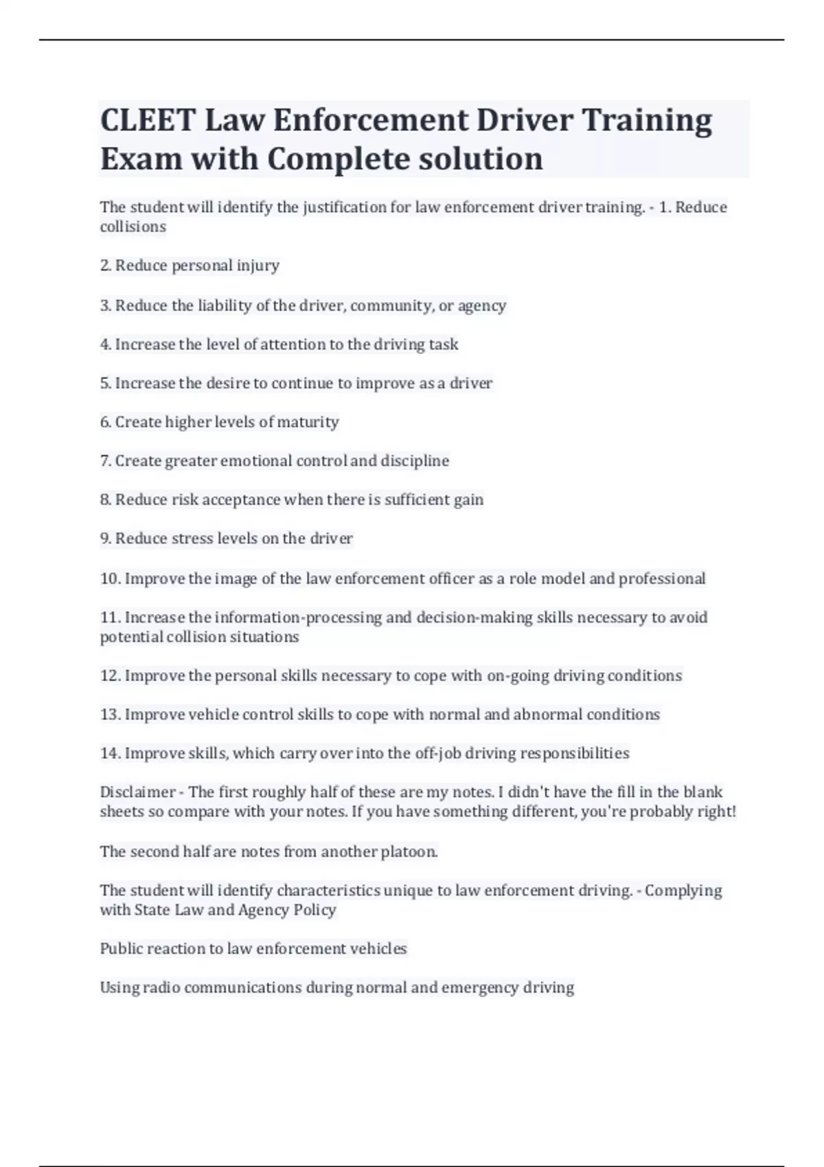 CLEET Law Enforcement Driver Training Exam with Complete solution The student will identify the justification for law enforcement driver training. - 1. Reduce collisions 2. Reduce personal injury 3. Reduce the liability of the driver, community, or agency 4. Increase the level of attention to the driving task 5. Increase the desire to continue to improve as a driver 6. Create higher levels of maturity 7. Create greater emotional control and discipline 8. Reduce risk acceptance when there is sufficient gain 9. Reduce stress levels on the driver 10. Improve the image of the law enforcement officer as a role model and professional 11. Increase the information-processing and decision-making skills necessary to avoid potential collision situations 12. Improve the personal skills necessary to cope with on-going driving conditions 13. Improve vehicle control skills to cope with normal and abnormal conditions 14. Improve skills, which carry over into the off-job driving responsibilities Disclaimer - The first roughly half of these are my notes. I didn't have the fill in the blank sheets so compare with your notes. If you have something different, you're probably right! The second half are notes from another platoon. The student will identify characteristics unique to law enforcement driving. - Complying with State Law and Agency Policy Public reaction to law enforcement vehicles Using radio communications during normal and emergency driving Driving under stress Driving with distractions (prisoners, suspects, etc) Driving on patrol (observing cars, buildings, people; wanted lists; listening to radio) The student will identify statutory law, case law, and the principles of liability governing non-emergency, emergency, and pursuit driving law enforcement officers, supervisors, and agencies may be held civilly liable for injuries arising from law enforcement driving activities. - A. State Statute Requirements - Non-Emergency Driving 1. Oklahoma has no statutes that specifically govern non-emergency law enforcement driving. State statutory provisions that govern the motoring public generally regulate non-emergency driving. 2. Agency Policy Requirements - Non-Emergency Driving. Must conform to the requirements of agency policy in order to enjoy protection from civil liability. Failure to comply with agency policy on non-emergency driving may be considered as evidence of the officer's negligence at trial. B. State Statute Requirements - Emergency Response Driving 1. Oklahoma has enacted statutes, which govern the use of law enforcement vehicles in emergency situations. ( I did not write these down...) The student will identify the factors that are involved with and impact the initiation and termination of a Law Enforcement Vehicle Pursuit. - "The safety of an officer and the general public are paramount to the total pursuit situation. Factors that assist in decision-making: No statutory requirements to start/stop pursuit, instead based on Agency Policy, violations, weather, traffic, speeds involved, driving skills, mental/emotional state, danger posed (suspect/LEO driving), equipment status, vehicle capability, alternative methods of apprehension, felony vs. misdemeanor, etc. When pursuit becomes hazardous, it should be terminated. The student will identify the human factors that contribute to law enforcement driving collisions. - The stress endured during pursuit can greatly affect an officer's risk-taking decisions. Attitudes and emotions become significant factors. Prejudice and bias are specific types of attitudes usually based on emotional factors: Psychological Factors: our emotions, high risk attitudes, overconfidence in driving capabilities.
