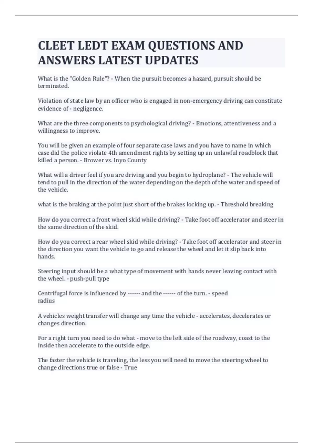 CLEET LEDT EXAM QUESTIONS AND ANSWERS LATEST UPDATES What is the "Golden Rule"? - When the pursuit becomes a hazard, pursuit should be terminated. Violation of state law by an officer who is engaged in non-emergency driving can constitute evidence of - negligence. What are the three components to psychological driving? - Emotions, attentiveness and a willingness to improve. You will be given an example of four separate case laws and you have to name in which case did the police violate 4th amendment rights by setting up an unlawful roadblock that killed a person. - Brower vs. Inyo County What will a driver feel if you are driving and you begin to hydroplane? - The vehicle will tend to pull in the direction of the water depending on the depth of the water and speed of the vehicle. what is the braking at the point just short of the brakes locking up. - Threshold breaking How do you correct a front wheel skid while driving? - Take foot off accelerator and steer in the same direction of the skid. How do you correct a rear wheel skid while driving? - Take foot off accelerator and steer in the direction you want the vehicle to go and release the wheel and let it slip back into hands. Steering input should be a what type of movement with hands never leaving contact with the wheel. - push-pull type Centrifugal force is influenced by ------ and the ------ of the turn. - speed radius A vehicles weight transfer will change any time the vehicle - accelerates, decelerates or changes direction. For a right turn you need to do what - move to the left side of the roadway, coast to the inside then accelerate to the outside edge. The faster the vehicle is traveling, the less you will need to move the steering wheel to change directions true or false - True what is the leading cause of most law enforcement vehicle crashes. - Excessive speed During a pursuit, the human body receives adrenaline due to the high anxiety. How can this be controlled? - By taking slow and full breaths. When is the correct time to use radio transmissions during a pursuit? - straight away only How far away from a car should you stay away from while in pursuit? - 3-5 seconds Where should you position you vehicle while in pursuit? - When it can be done safely, position your vehicle slightly to the left of the pursued vehicle. What is the main reason for doing a safety inspection on a vehicle prior to driving it? - yours, mine and others safety A driver who fails to prevent or detect changes in vehicle mechanical sub-systems increases the possibility of having to - react to failure. What is the "rule of thumbs" for proper seat adjustment? - With elbows slightly bent and hands together, wrists should rest on the steering wheel. What is rolling friction? - The best kind of friction, wheels are turning AND are still gripping the road to allow control