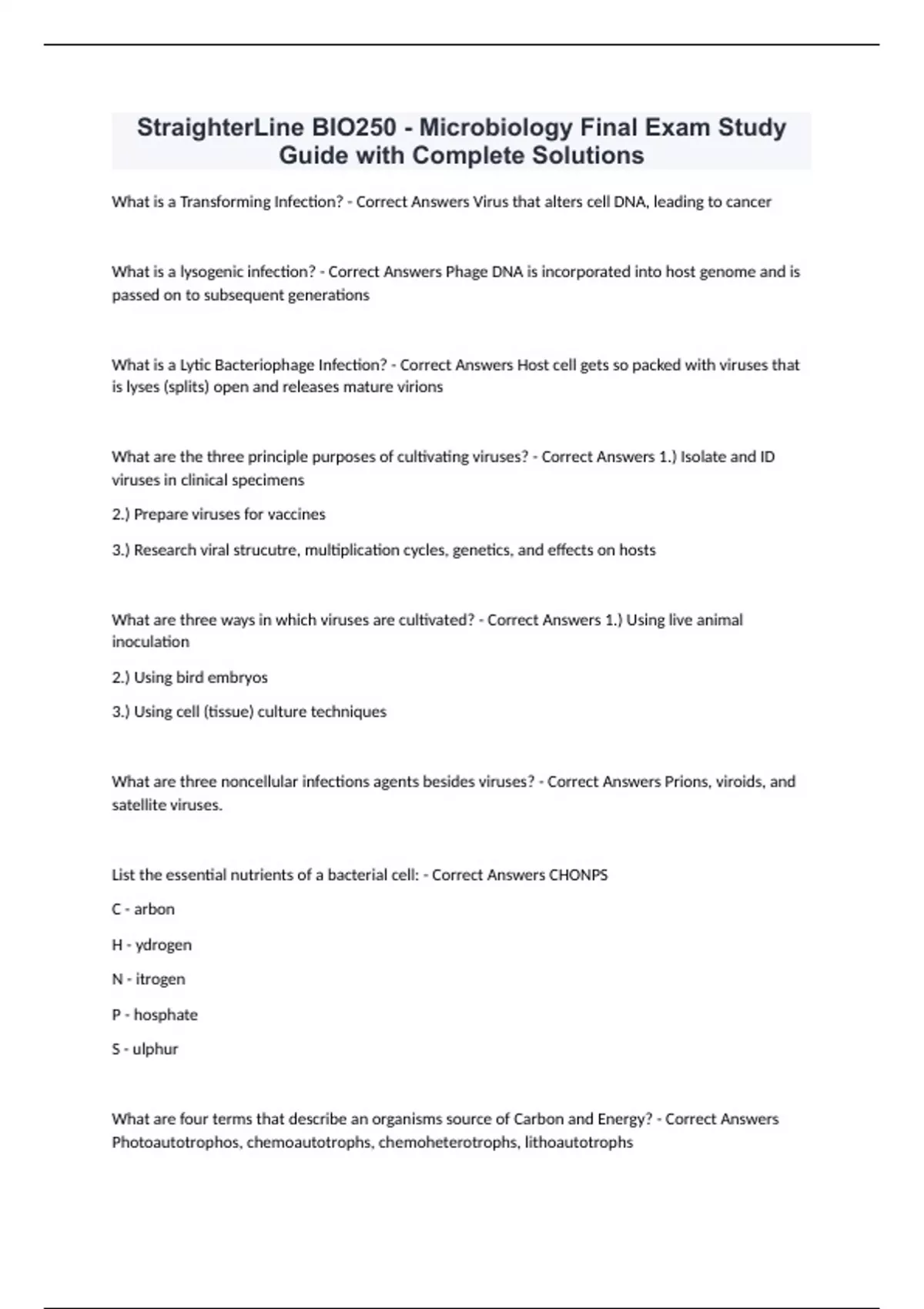 StraighterLine BIO250 - Microbiology Final Exam Study Guide with Complete Solutions What is a Transforming Infection? - Correct Answers Virus that alters cell DNA, leading to cancer What is a lysogenic infection? - Correct Answers Phage DNA is incorporated into host genome and is passed on to subsequent generations What is a Lytic Bacteriophage Infection? - Correct Answers Host cell gets so packed with viruses that is lyses (splits) open and releases mature virions What are the three principle purposes of cultivating viruses? - Correct Answers 1.) Isolate and ID viruses in clinical specimens 2.) Prepare viruses for vaccines 3.) Research viral strucutre, multiplication cycles, genetics, and effects on hosts What are three ways in which viruses are cultivated? - Correct Answers 1.) Using live animal inoculation 2.) Using bird embryos 3.) Using cell (tissue) culture techniques What are three noncellular infections agents besides viruses? - Correct Answers Prions, viroids, and satellite viruses. List the essential nutrients of a bacterial cell: - Correct Answers CHONPS C - arbon H - ydrogen N - itrogen P - hosphate S - ulphur What are four terms that describe an organisms source of Carbon and Energy? - Correct Answers Photoautotrophos, chemoautotrophs, chemoheterotrophs, lithoautotrophs Define Sapr