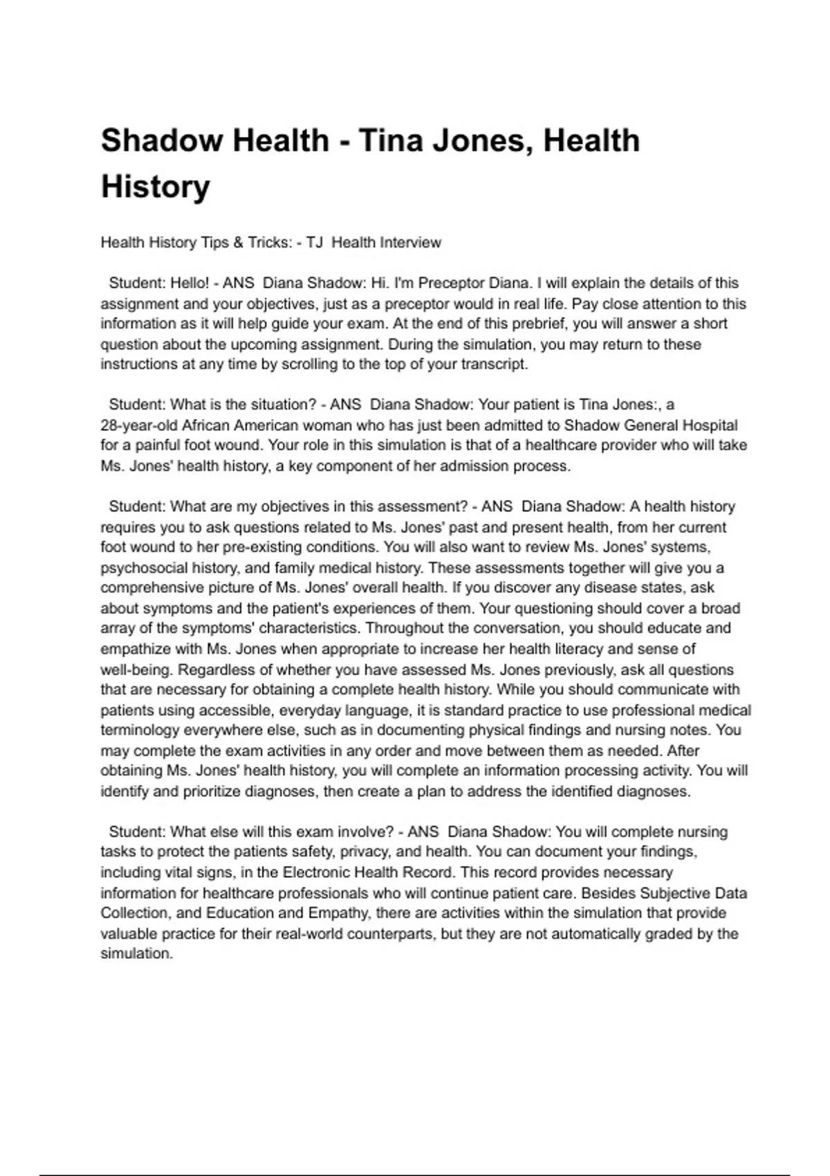 Shadow Health - Tina Jones, Health History Health History Tips & Tricks: - ANS TJ Health Interview Student: Hello! - ANS Diana Shadow: Hi. I'm Preceptor Diana. I will explain the details of this assignment and your objectives, just as a preceptor would in real life. Pay close attention to this information as it will help guide your exam. At the end of this prebrief, you will answer a short question about the upcoming assignment. During the simulation, you may return to these instructions at any time by scrolling to the top of your transcript. Student: What is the situation? - ANS Diana Shadow: Your patient is Tina Jones:, a 28-year-old African American woman who has just been admitted to Shadow General Hospital for a painful foot wound. Your role in this simulation is that of a healthcare provider who will take Ms. Jones' health history, a key component of her admission process. Student: What are my objectives in this assessment? - ANS Diana Shadow: A health history requires you to ask questions related to Ms. Jones' past and present health, from her current foot wound to her pre-existing conditions. You will also want to review Ms. Jones' systems, psychosocial history, and family medical history. These assessments together will give you a comprehensive picture of Ms. Jones' overall health. If you discover any disease states, ask about symptoms and the patient's experiences of them. Your questioning should cover a broad array of the symptoms' characteristics. Throughout the conversation, you should educate and empathize with Ms. Jones when appropriate to increase her health literacy and sense of well-being. Regardless of whether you have assessed Ms. Jones previously, ask all questions that are necessary for obtaining a complete health history. While you should communicate with patients using accessible, everyday language, it is standard practice to use professional medical terminology everywhere else, such as in documenting physical findings and nursing notes. You may complete the exam activities in any order and move between them as needed. After obtaining Ms. Jones' health history, you will complete an information processing activity. You will identify and prioritize diagnoses, then create a plan to address the identified diagnoses.