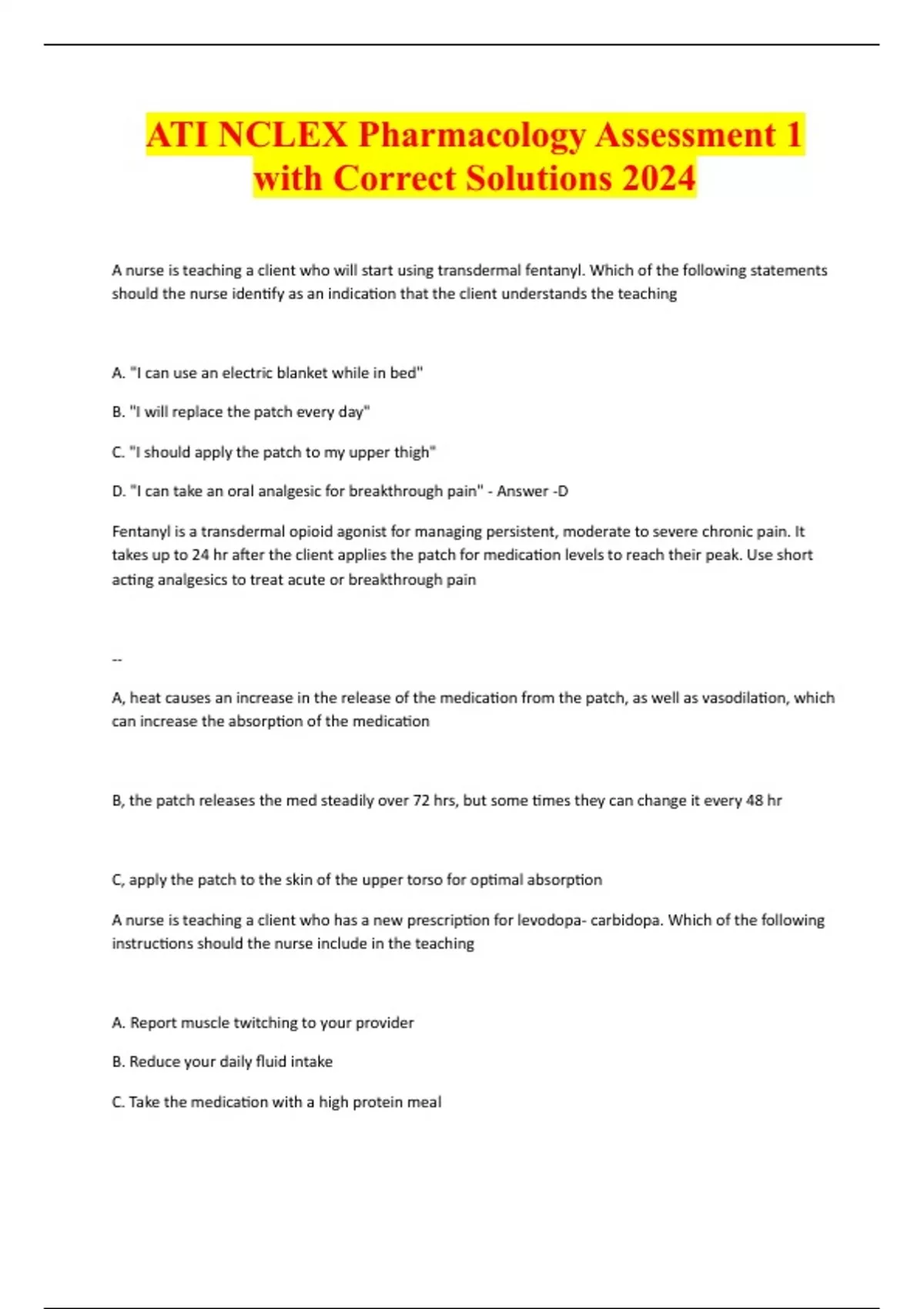 ATI NCLEX Pharmacology Assessment 1 with Correct Solutions 2024 A nurse is teaching a client who will start using transdermal fentanyl. Which of the following statements should the nurse identify as an indication that the client understands the teaching A. "I can use an electric blanket while in bed" B. "I will replace the patch every day" C. "I should apply the patch to my upper thigh" D. "I can take an oral analgesic for breakthrough pain" - Answer -D Fentanyl is a transdermal opioid agonist for managing persistent, moderate to severe chronic pain. It takes up to 24 hr after the client applies the patch for medication levels to reach their peak. Use short acting analgesics to treat acute or breakthrough pain -- A, heat causes an increase in the release of the medication from the patch, as well as vasodilation, which can increase the absorption of the medication B, the patch releases the med steadily over 72 hrs, but some times they can change it every 48 hr C, apply the patch to the skin of the upper torso for optimal absorption A nurse is teaching a client who has a new prescription for levodopa- carbidopa. Which of the following instructions should the nurse include in the teaching A. Report muscle twitching to your provider B. Reduce your daily fluid intake C. Take the medication with a high protein mealD. Discontinue the medication if your urine turns a dark color - Answer -A Levodopa carbidopa can cause dyskinesias with toxicity and to report muscle twitching, tremors, and spastic winking -- B, reducing fluid intake can increase risk of orthostatic hypotension. Drink at least 2-3 L of fluid daily C, protein reduces the absorption of levodopa carbidopa D, urine and sweat can become dark in color, but this is harm