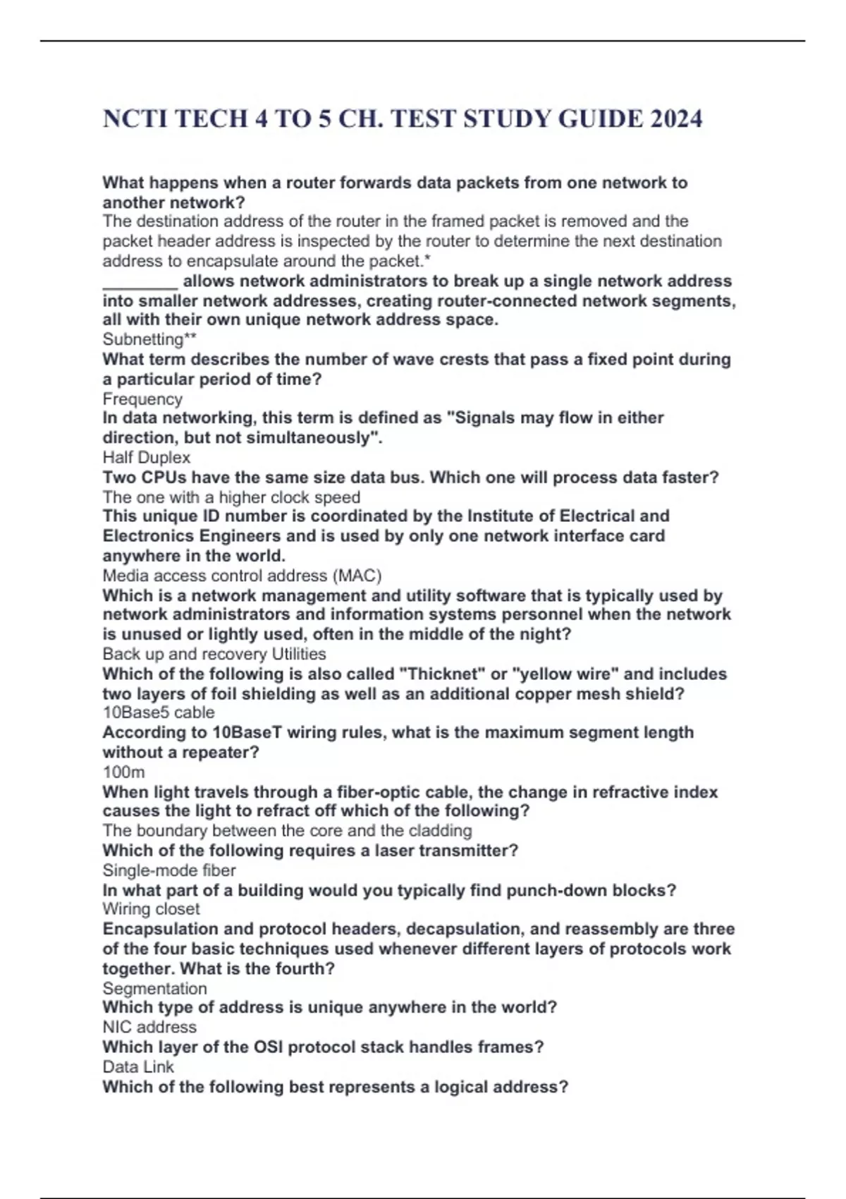 NCTI TECH 4 TO 5 CH. TEST STUDY GUIDE 2024 What happens when a router forwards data packets from one network to another network? The destination address of the router in the framed packet is removed and the packet header address is inspected by the router to determine the next destination address to encapsulate around the packet.* ________ allows network administrators to break up a single network address into smaller network addresses, creating router-connected network segments, all with their own unique network address space. Subnetting** What term describes the number of wave crests that pass a fixed point during a particular period of time? Frequency In data networking, this term is defined as "Signals may flow in either direction, but not simultaneously". Half Duplex Two CPUs have the same size data bus. Which one will process data faster? The one with a higher clock speed This unique ID number is coordinated by the Institute of Electrical and Electronics Engineers and is used by only one network interface card anywhere in the world. Media access control address (MAC) Which is a network management and utility software that is typically used by network administrators and information systems personnel when the network is unused or lightly used, often in the middle of the night? Back up and recovery Utilities Which of the following is also called "Thicknet" or "yellow wire" and includes two layers of foil shielding as well as an additional copper mesh shield? 10Base5 cable According to 10BaseT wiring rules, what is the maximum segment length without a repeater? 100m When light travels through a fiber-optic cable, the change in refractive index causes the light to refract off which of the following? The boundary between the core and the cladding Which of the following requires a laser transmitter? Single-mode fiber In what part of a building would you typically find punch-down blocks? Wiring closet Encapsulation and protocol headers, decapsulation, and reassembly are three of the four basic techniques used whenever different layers of protocols work together. What is the fourth? Segmentation Which type of address is unique anywhere in the world? NIC address Which layer of the OSI protocol stack handles frames? Data Link Which of the following best represents a logical address? IPv6