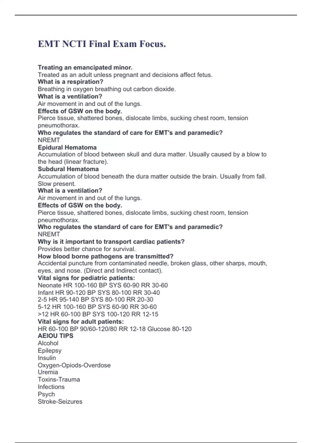 Treating an emancipated minor. Treated as an adult unless pregnant and decisions affect fetus. What is a respiration? Breathing in oxygen breathing out carbon dioxide. What is a ventilation? Air movement in and out of the lungs. Effects of GSW on the body. Pierce tissue, shattered bones, dislocate limbs, sucking chest room, tension pneumothorax. Who regulates the standard of care for EMT's and paramedic? NREMT Epidural Hematoma Accumulation of blood between skull and dura matter. Usually caused by a blow to the head (linear fracture). Subdural Hematoma Accumulation of blood beneath the dura matter outside the brain. Usually from fall. Slow present. What is a ventilation? Air movement in and out of the lungs. Effects of GSW on the body. Pierce tissue, shattered bones, dislocate limbs, sucking chest room, tension pneumothorax. Who regulates the standard of care for EMT's and paramedic? NREMT Why is it important to transport cardiac patients? Provides better chance for survival. How blood borne pathogens are transmitted? Accidental puncture from contaminated needle, broken glass, other sharps, mouth, eyes, and nose. (Direct and Indirect contact). Vital signs for pediatric patients: Neonate HR 100-160 BP SYS 60-90 RR 30-60 Infant HR 90-120 BP SYS 80-100 RR 30-40 2-5 HR 95-140 BP SYS 80-100 RR 20-30 5-12 HR 100-160 BP SYS 60-90 RR 30-60 >12 HR 60-100 BP SYS 100-120 RR 12-15 Vital signs for adult patients: HR 60-100 BP 90/60-120/80 RR 12-18 Glucose 80-120 AEIOU TIPS Alcohol Epilepsy Insulin Oxygen-Opiods-Overdose Uremia Toxins-Trauma Infections Psych Stroke-Seizures